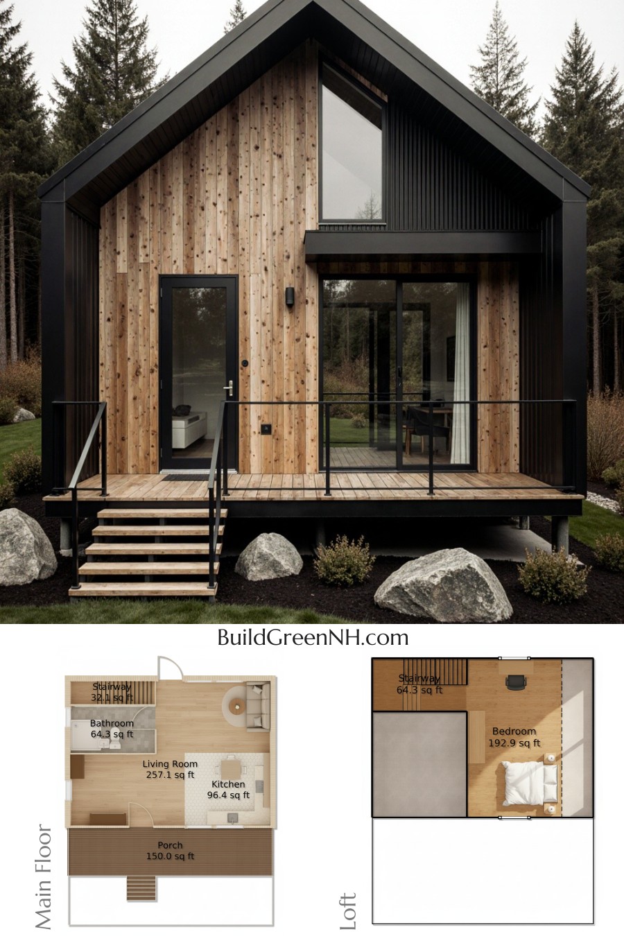 This is a compact gambrel-loft home designed for efficient living with a bold, barn-inspired attitude. Smart footprint. Generous vibe. Facade…
