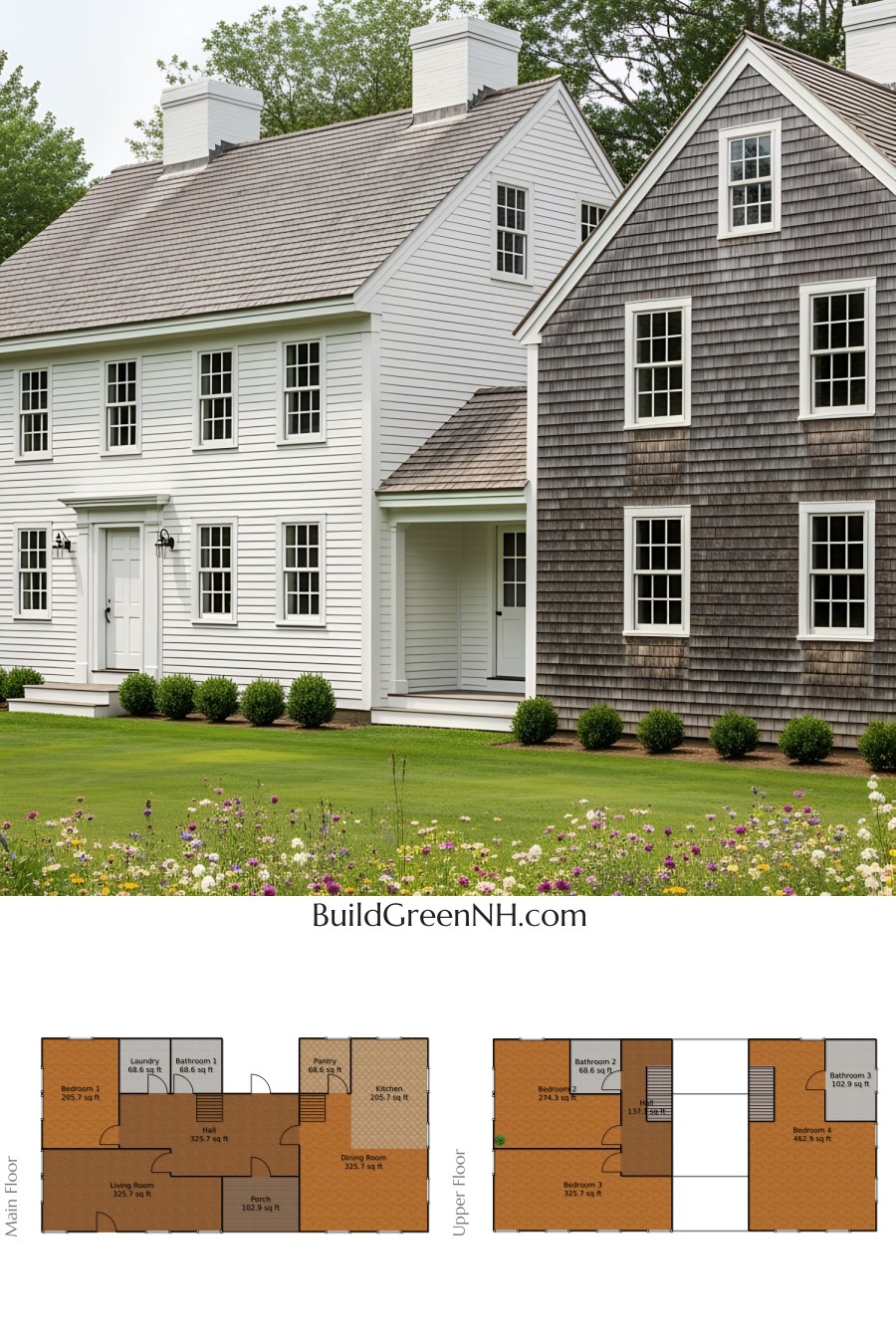 A composed New England farmhouse with a connected barn wing. Clean symmetry, generous divided‑lite windows, and crisp trim. Cedar shingle…