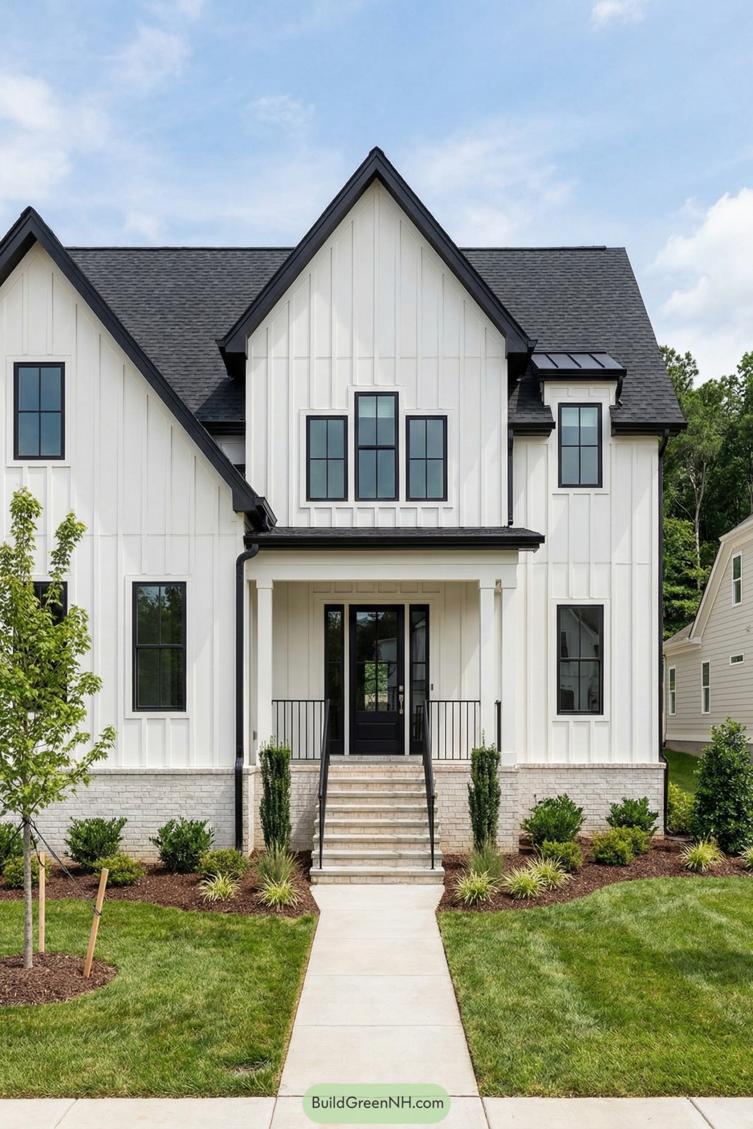Clean white board and batten siding stretches up the tall gables, while the black standing seam roof and window frames keep everything feeling sharp and current. The front steps pull you straight toward that solid black door, framed by simple square columns that make the entry feel confident but not fussy.