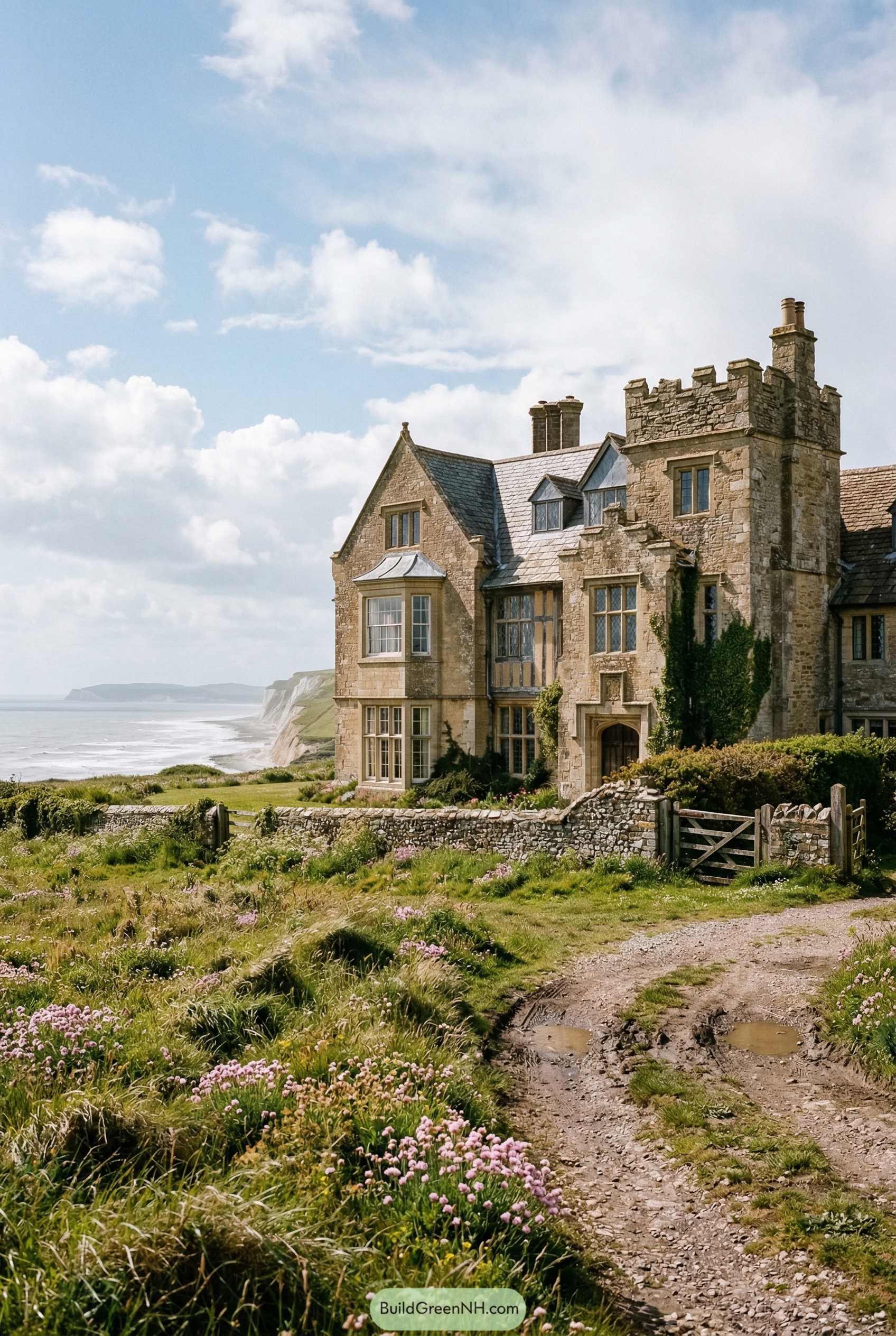 This manor leans into a coastal baronial mood with rough cut stone walls, a crenellated corner tower, and steep gables that give the facade a quietly storybook edge. You can feel the shoreline in it, from the sturdy massing to the slate rooflines, as if the house decided umbrellas were simply not its thing.