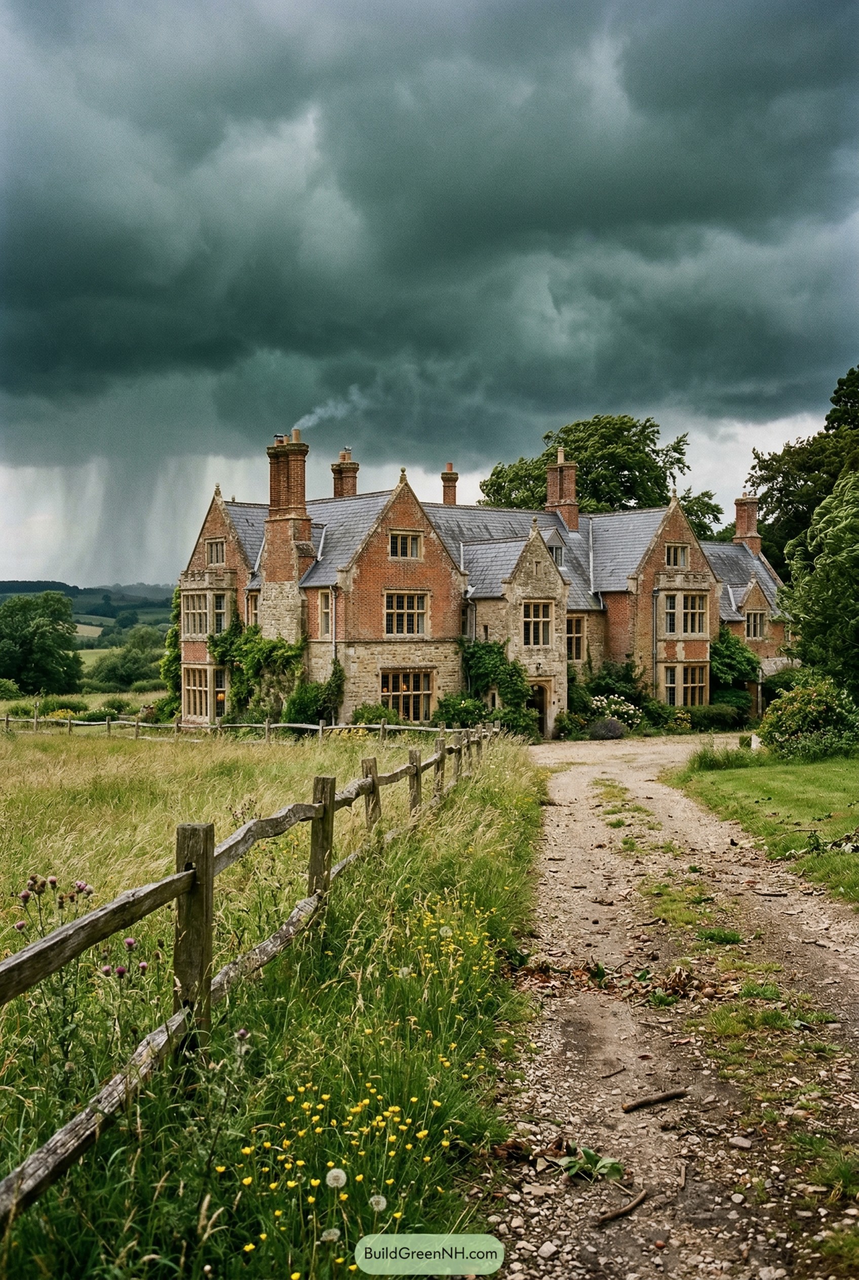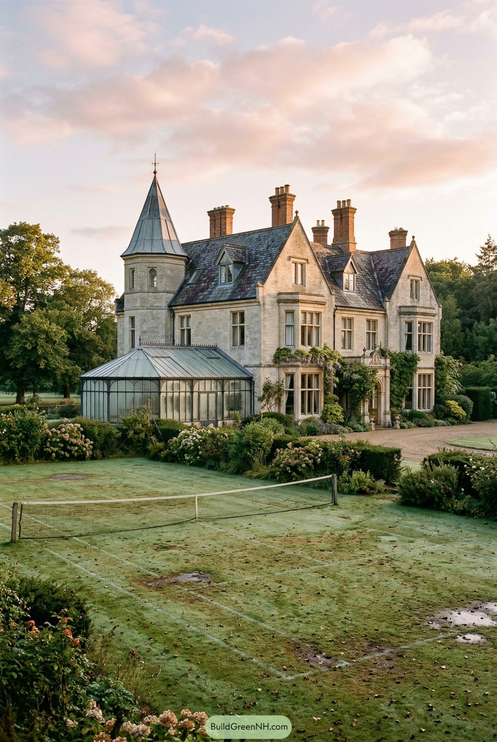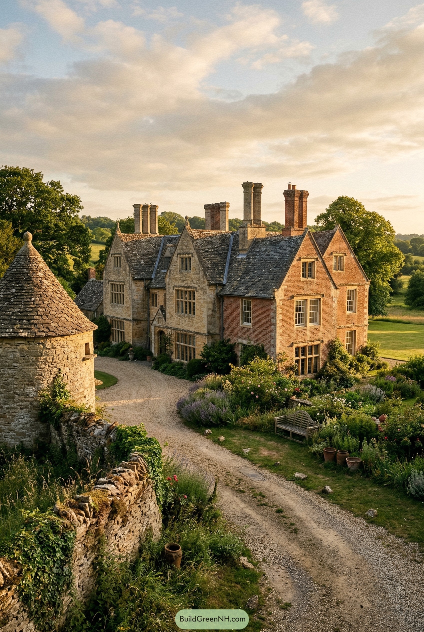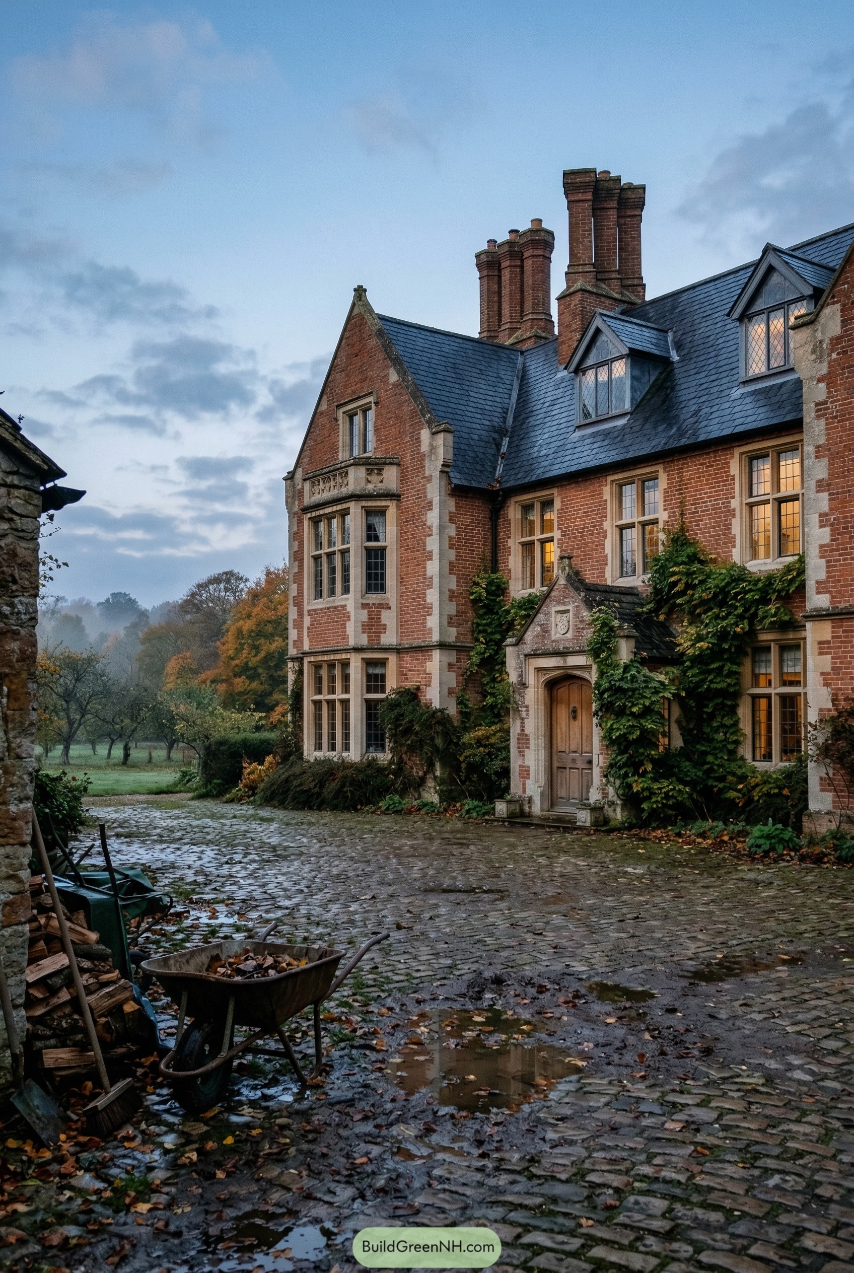 We kept pulling from Tudor, Jacobean, Arts and Crafts, Cotswold, and a touch of Gothic and Victorian country house charm too. You will spot it in the red brick and limestone, the slate roofs, the mullioned windows, and those chimneys that are, honestly, showing off.
