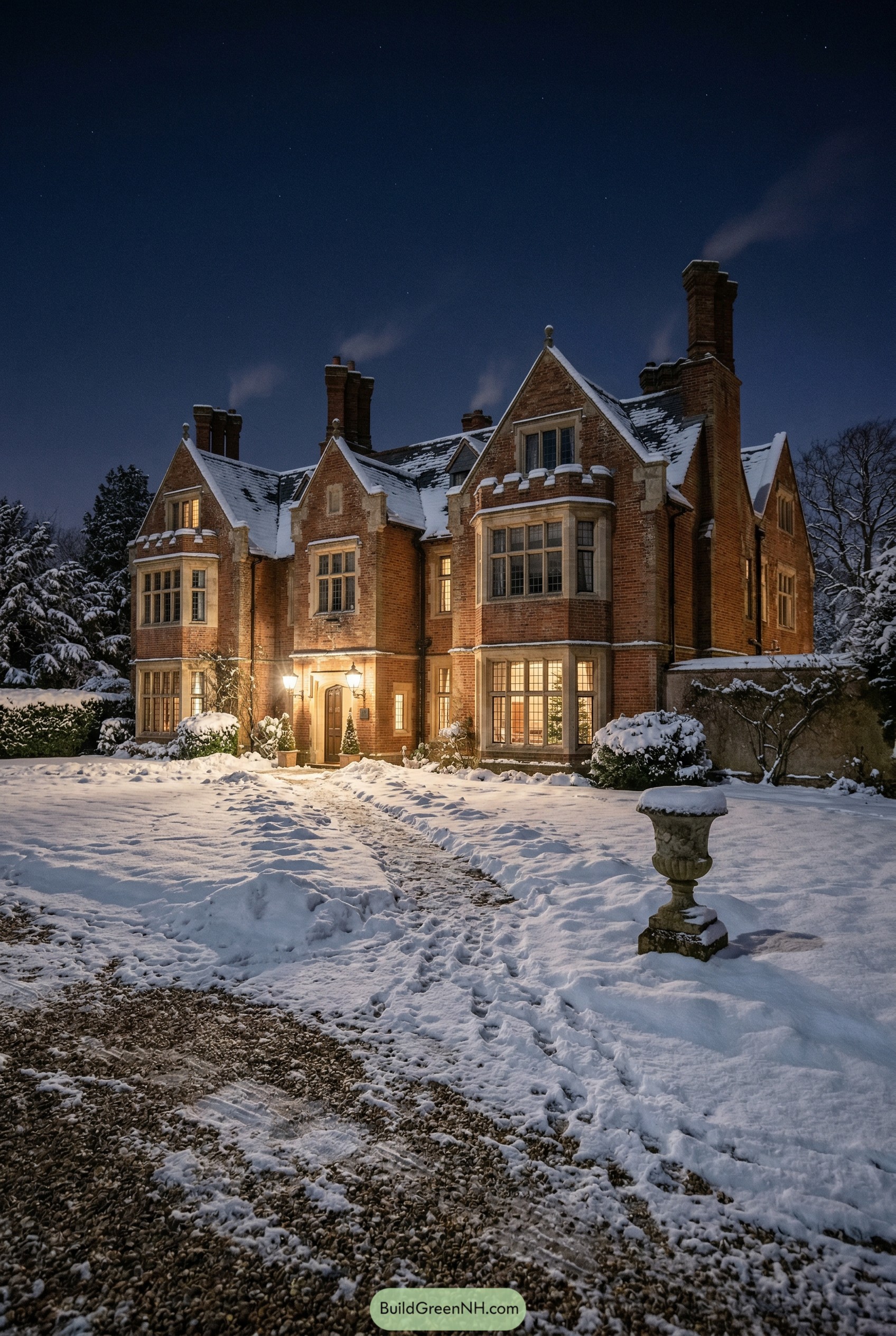 The slightly tucked entry keeps the composition welcoming, while the crenellated parapet details add a touch of old estate swagger without going costume mode. Snow on the roof only makes those strong rooflines clearer, and the whole place ends up feeling warm, composed, and a little smug in the best way.
