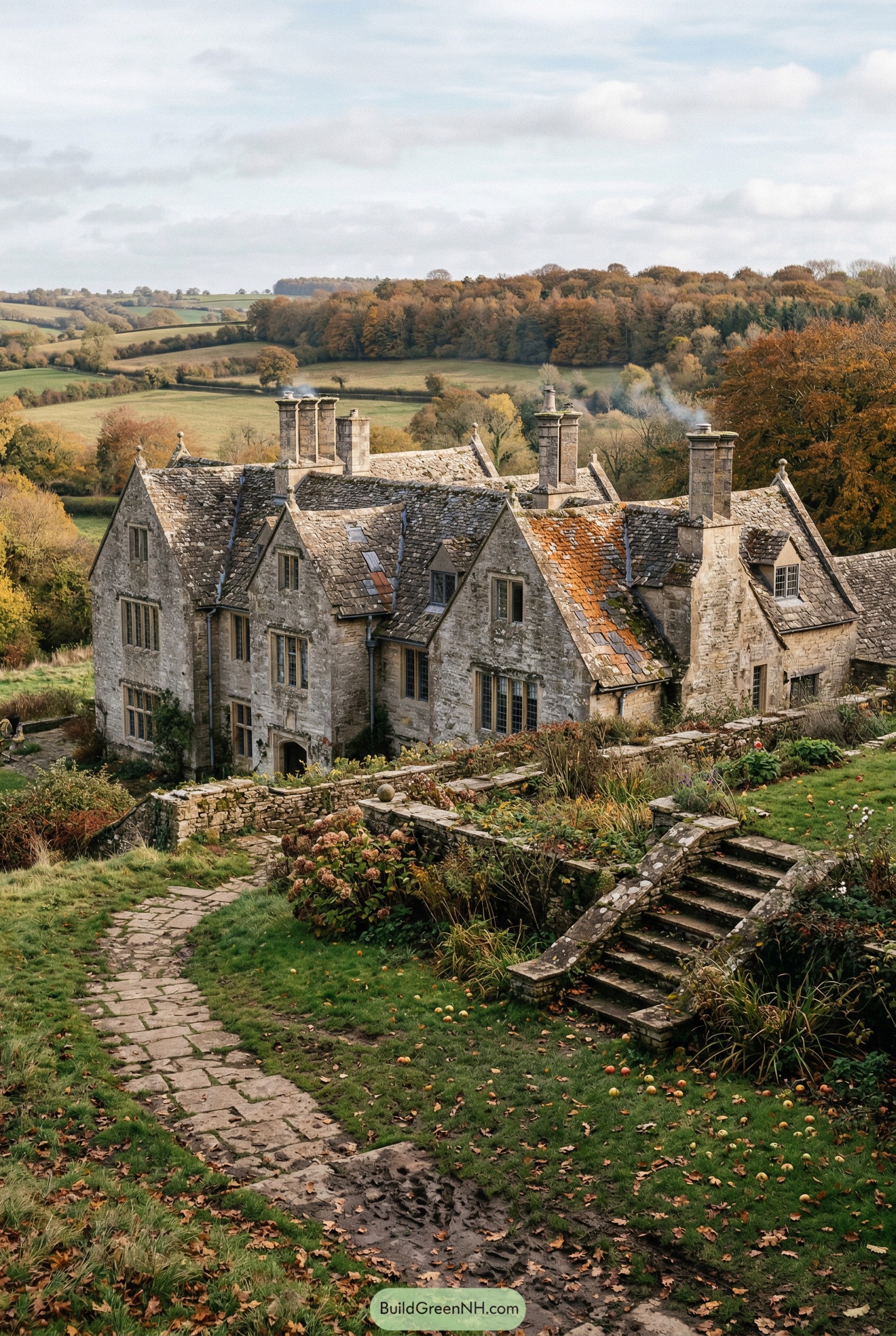The terraced garden and sturdy stone steps pull the design into the slope so the whole place sits naturally in the countryside instead of perching on top of it. Mullioned windows, rough limestone walls, and that wonderfully wonky roofline were inspired by old Cotswold estates, and yes, the chimneys are showing off a little.