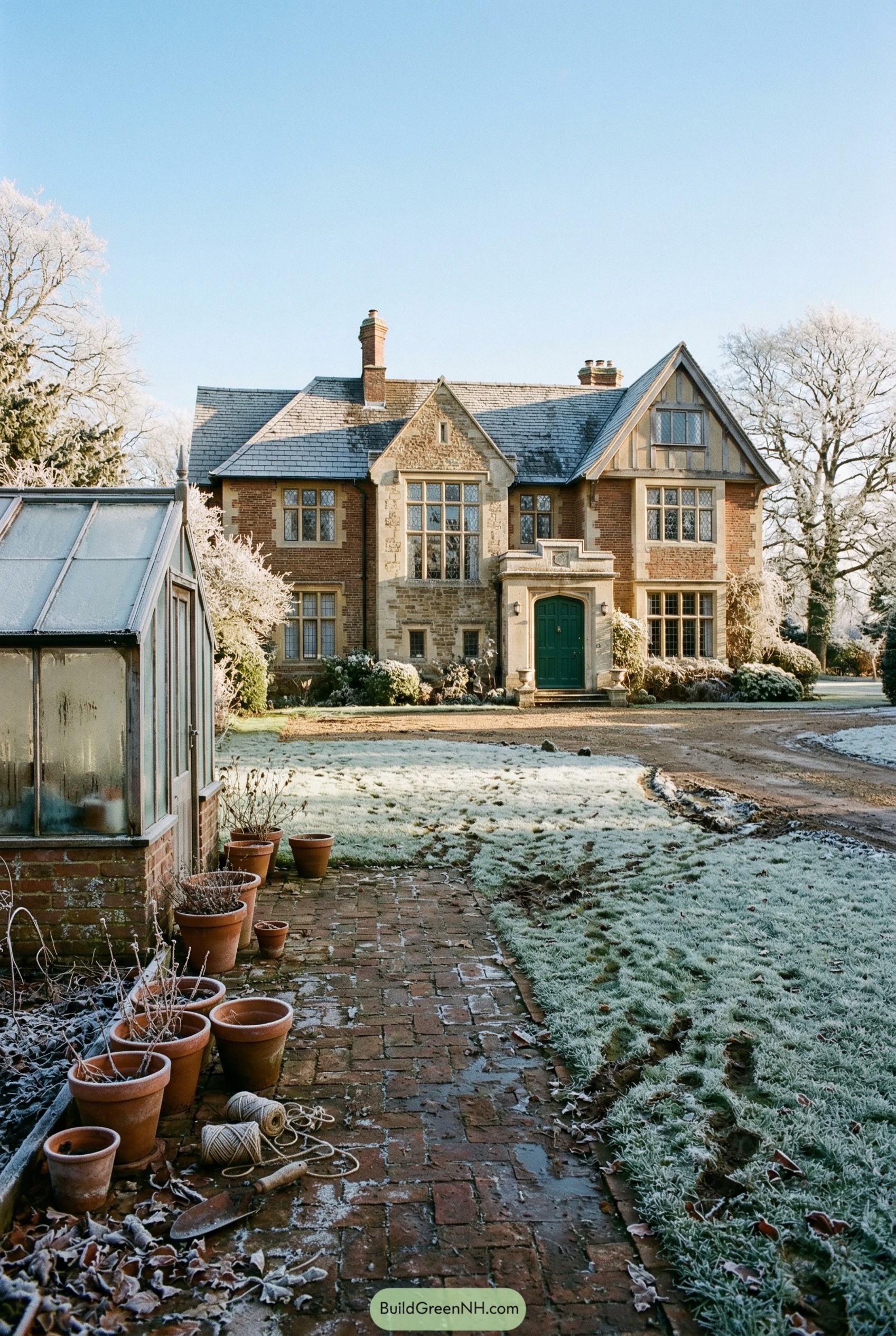 Tall leaded windows and the textured central bay make the house feel rooted and quietly grand, while the greenhouse and brick path pull everything back to garden life. It feels polished but not precious, which is nice because a manor like this should look ready for muddy boots and one very opinionated rose bush.