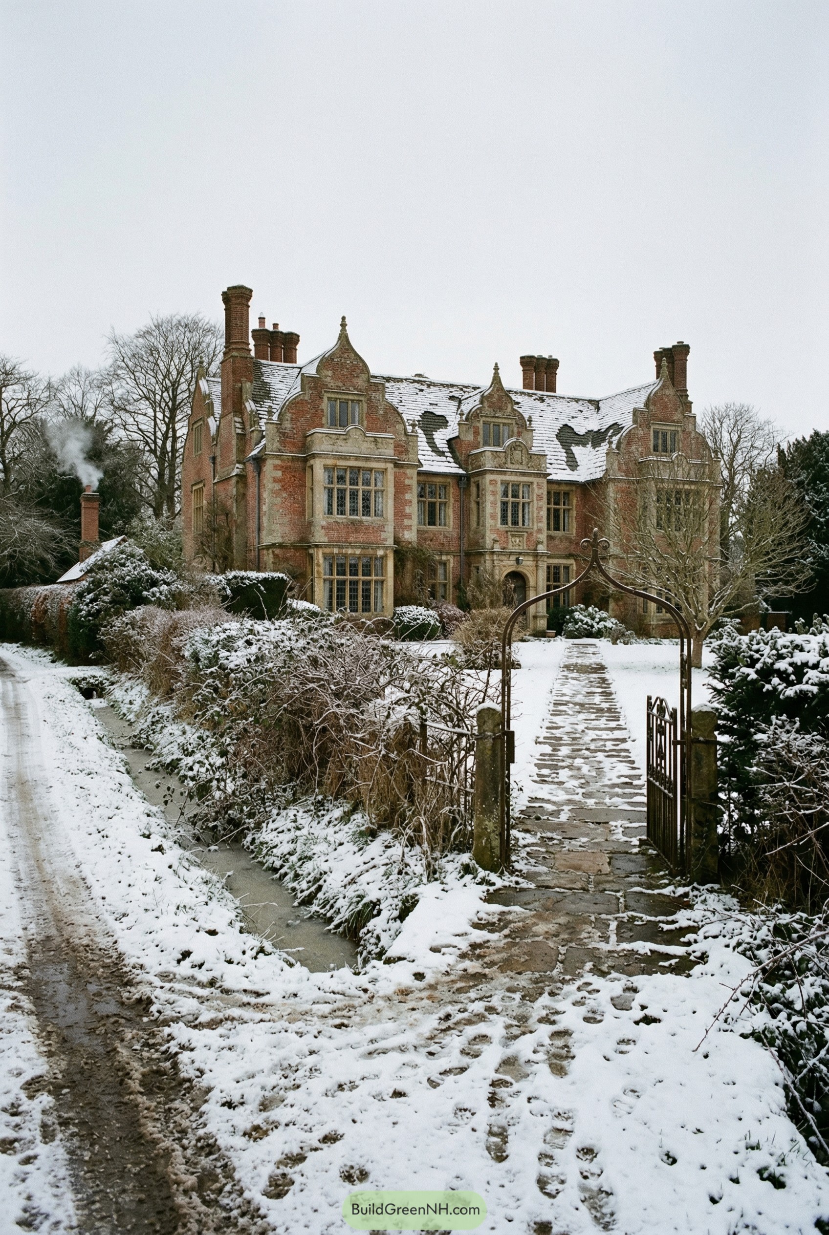 We pulled from late Jacobean country houses here, then softened it with a winding garden edge and a wrought iron gate that feels almost too polite. Even with snow on the roof, the deep eaves and tucked arched doorway make it feel welcoming, like it already knows where the tea is.