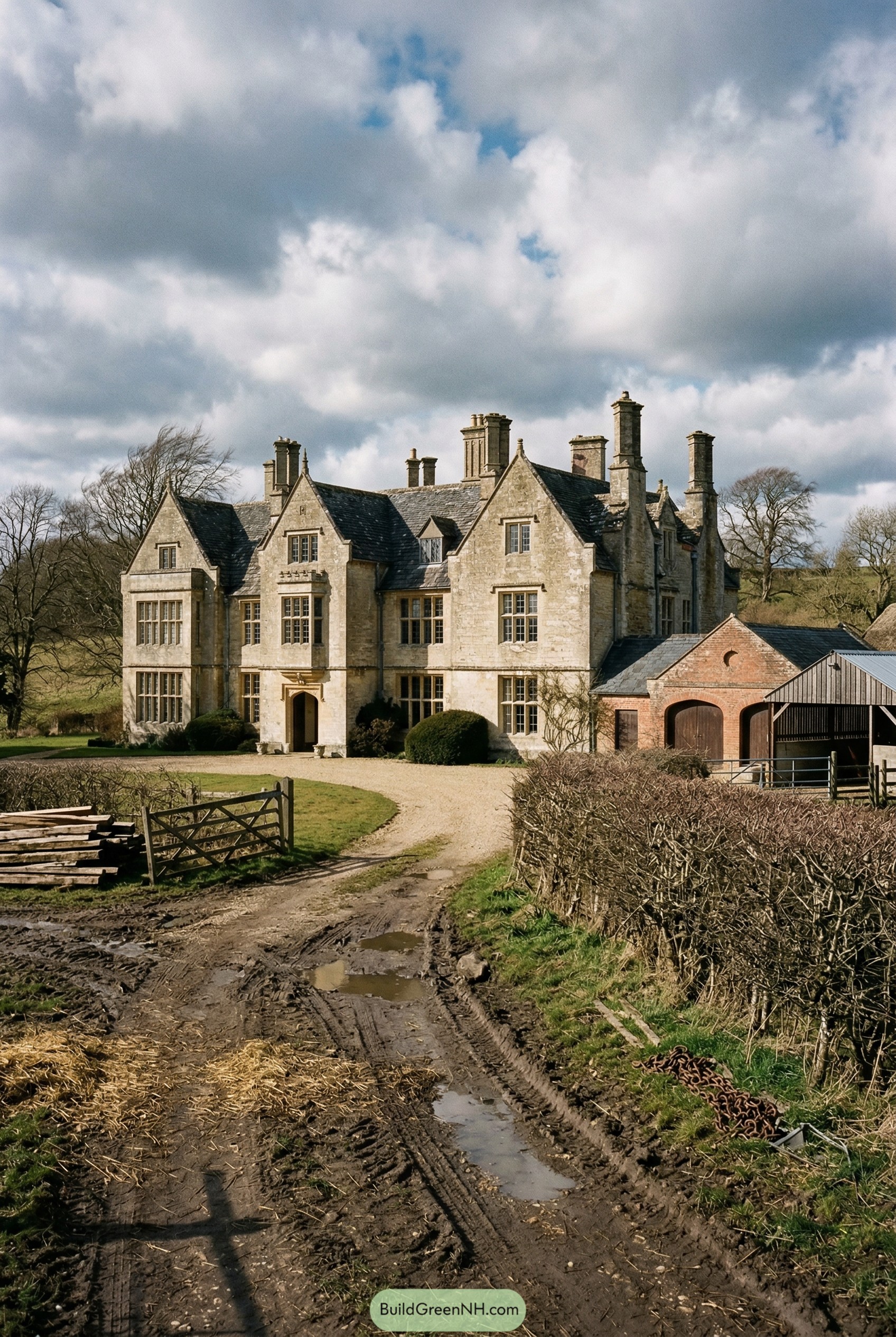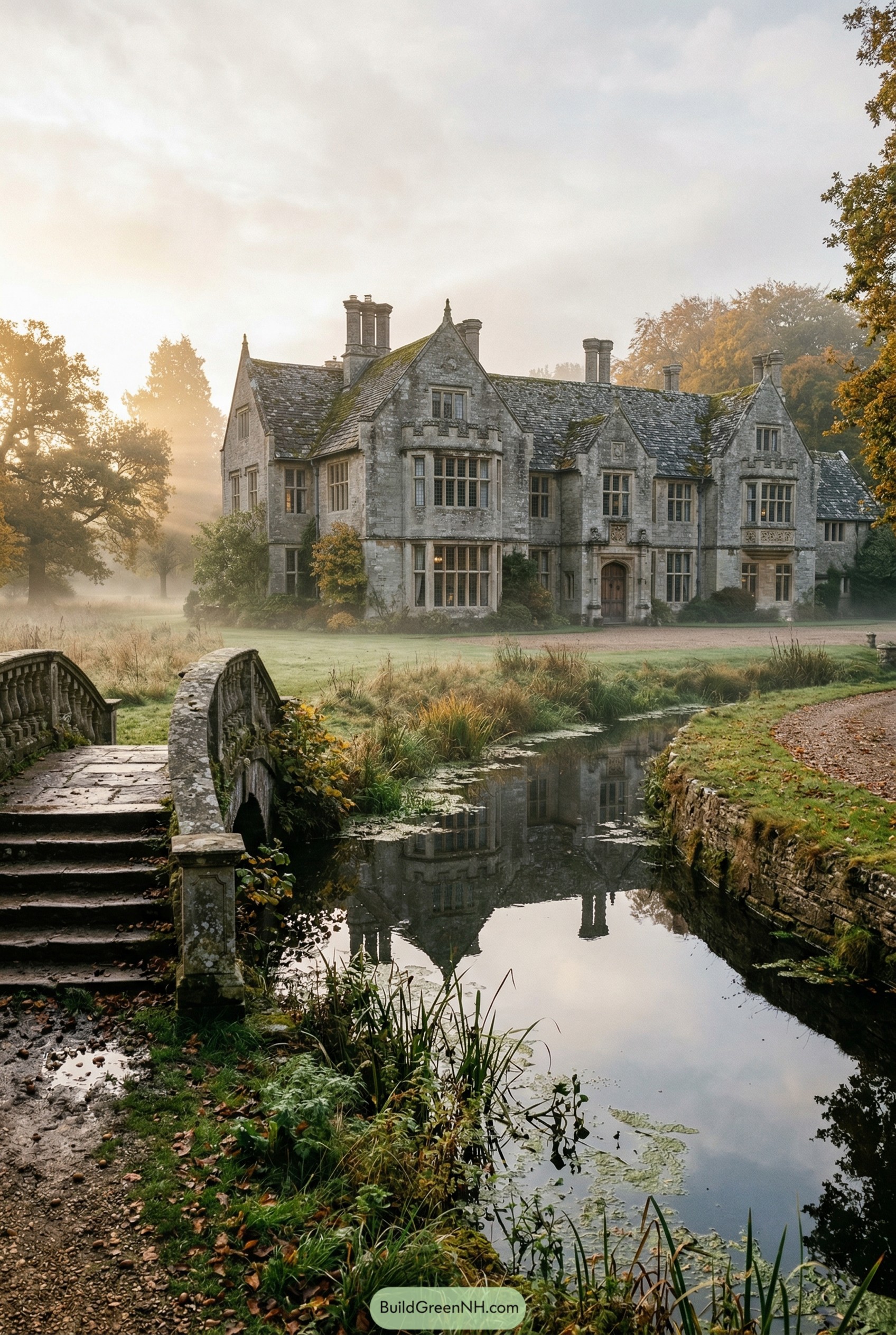 Weathered limestone, sharp front gables, and a tidy central pediment give this manor a lovely in between character, part Tudor memory and part Georgian polish. We were drawn to that balance because it keeps the facade refined without slipping into anything too prim.