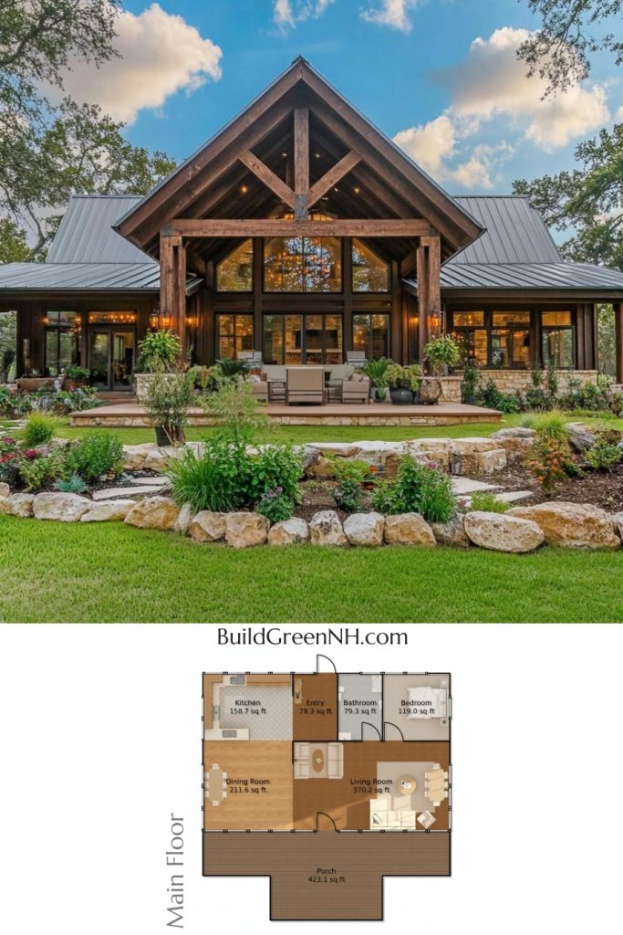 The house boasts a magnificent facade with a rustic elegance. Its wooden siding harmonizes with the environment, creating a warm and inviting exterior. The sleek metal roofing adds a modern touch, ensuring durability and style. Large windows promise abundant natural light, completing this architectural gem.