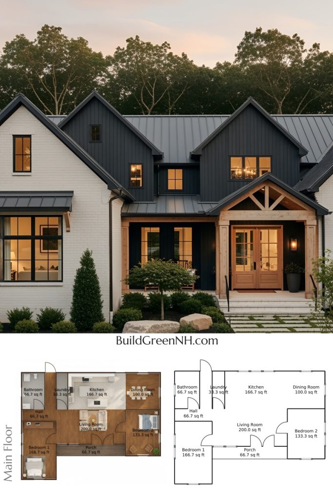 Envision a modern retreat with a sleek, captivating facade. This house flaunts vertical black siding, complemented by natural wood accents for a contemporary yet warm feel. The roof features sharp lines with durable metal, ensuring longevity and adding a stylish twist. Expansive windows gleam, welcoming light and creating an inviting aura.