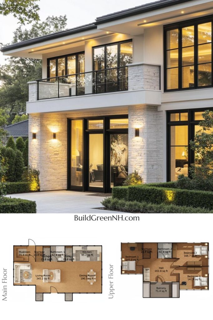 The facade leans modern: strong horizontal eaves, black-framed glazing, and a centered entry. Smooth stucco pairs with light stone veneer for a crisp contrast. A glass-railed balcony crowns the main entrance. Lighting is tucked into the soffits for a calm glow. Roofing is low-slope and dark, with deep overhangs that feel precise and confident.