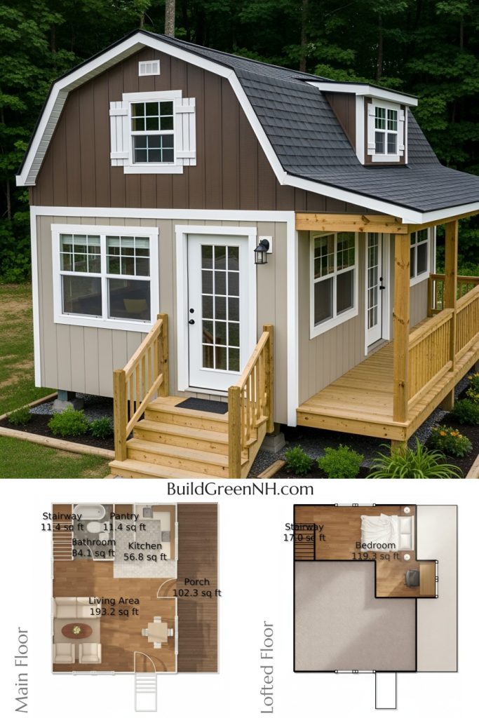This is a compact lofted tiny-house plan with a barn-style profile. Small footprint, big personality.