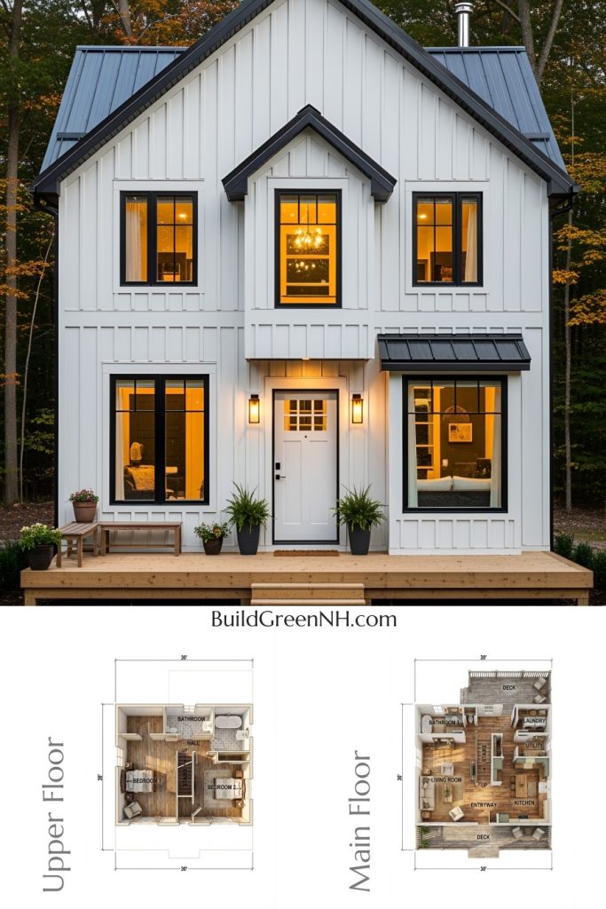 This design is a compact two-story cottage with modern farmhouse notes. It has a tight footprint, a simple massing, and a very efficient layout.
