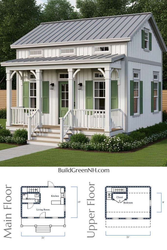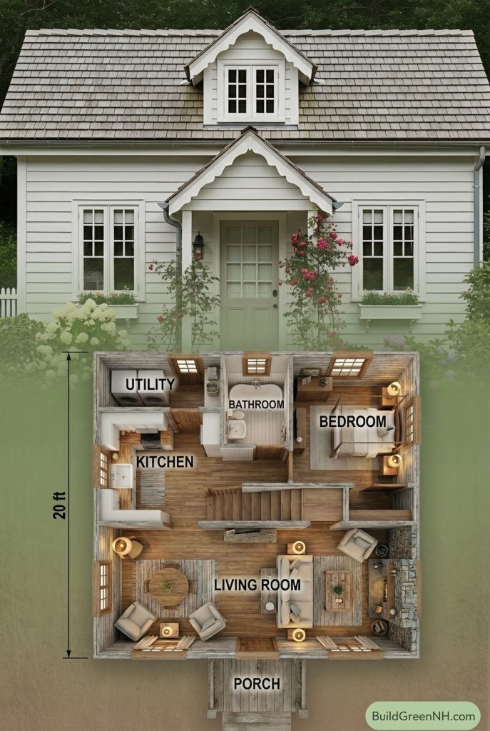 This compact two-story cottage design focuses on efficient space, classic proportions, and simple, charming detailing. With a 20 ft by 20 ft footprint, it offers just enough room for everyday comfort without wasting a single square foot.