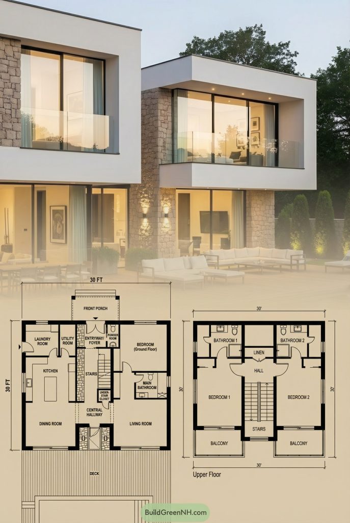 This design is a compact two-story modern home with a clean 30’ x 30’ footprint per level, crafted for efficient living with just enough drama to keep the neighbors curious.