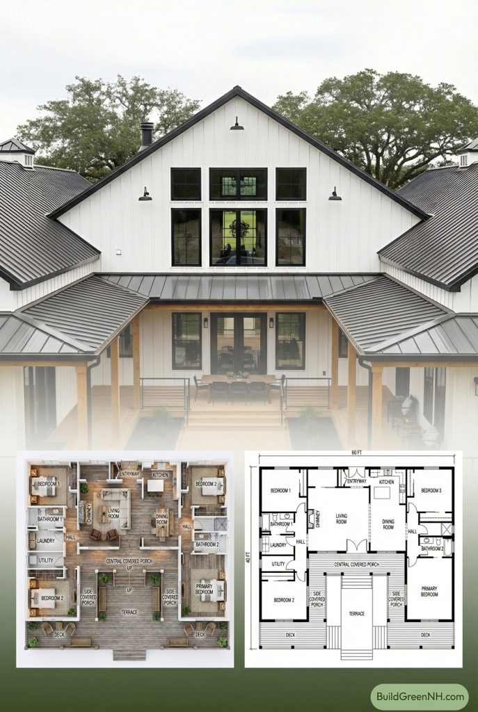 This design is a two-story modern farmhouse-style residence with a clean 60′ x 40′ footprint on both levels, planned for comfortable family living and generous entertaining.