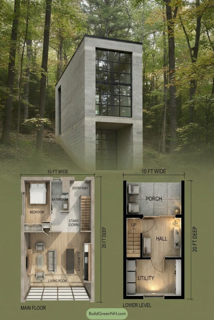 This compact two-story home is a modern cabin-style design with a smart 20 ft × 20 ft footprint on each level, created for people who like their houses efficient and their ceilings dramatically high.