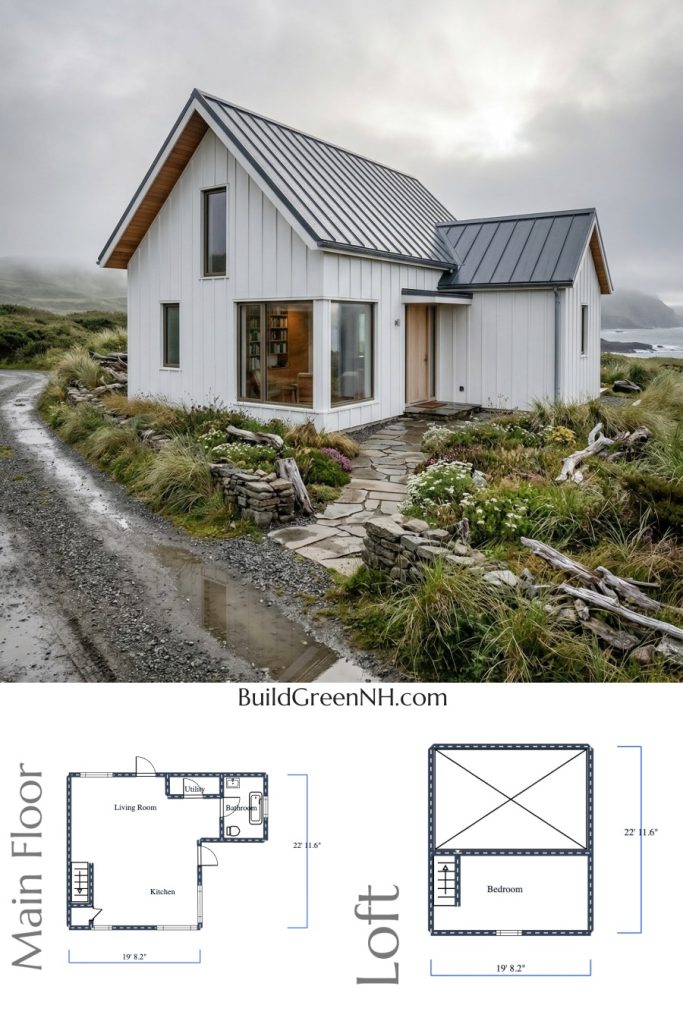 This is a compact modern cottage with a loft. It is a small-footprint design with open daily living below and private sleeping space above. Lean, efficient, and pleasantly unfussy.