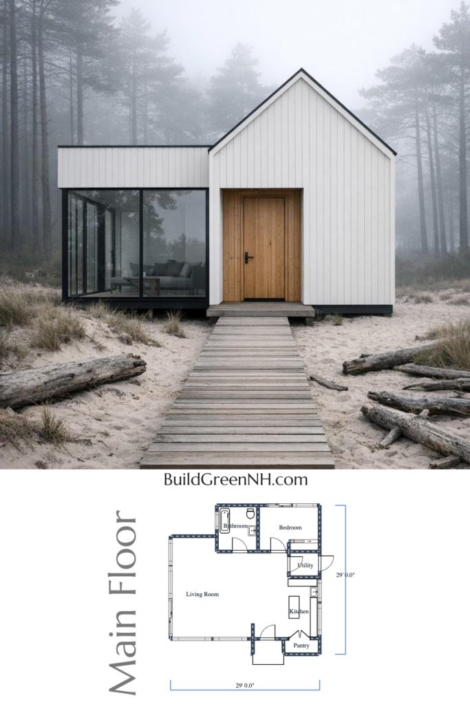 This design is a compact single-story modern cabin. It pairs a clean one-bedroom plan with a crisp, minimalist form. Small footprint. Strong presence.