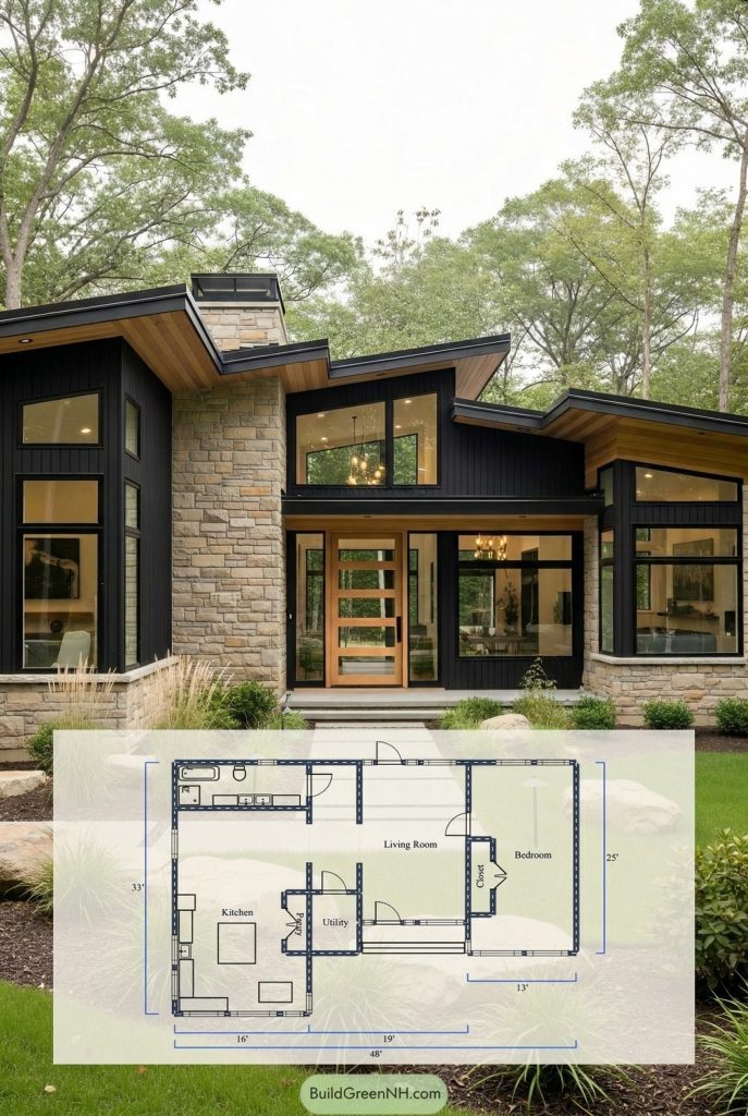 The facade is crisp and modern. Angled roof planes create a lively silhouette. Dark vertical board-and-batten siding is paired with natural stone at the chimney and base walls. Large black-framed windows sharpen the composition, while warm wood soffits and a modern wood entry door soften it. The roofing reads as low-slope standing-seam metal. No fussy trim. No roof circus. Just good geometry.