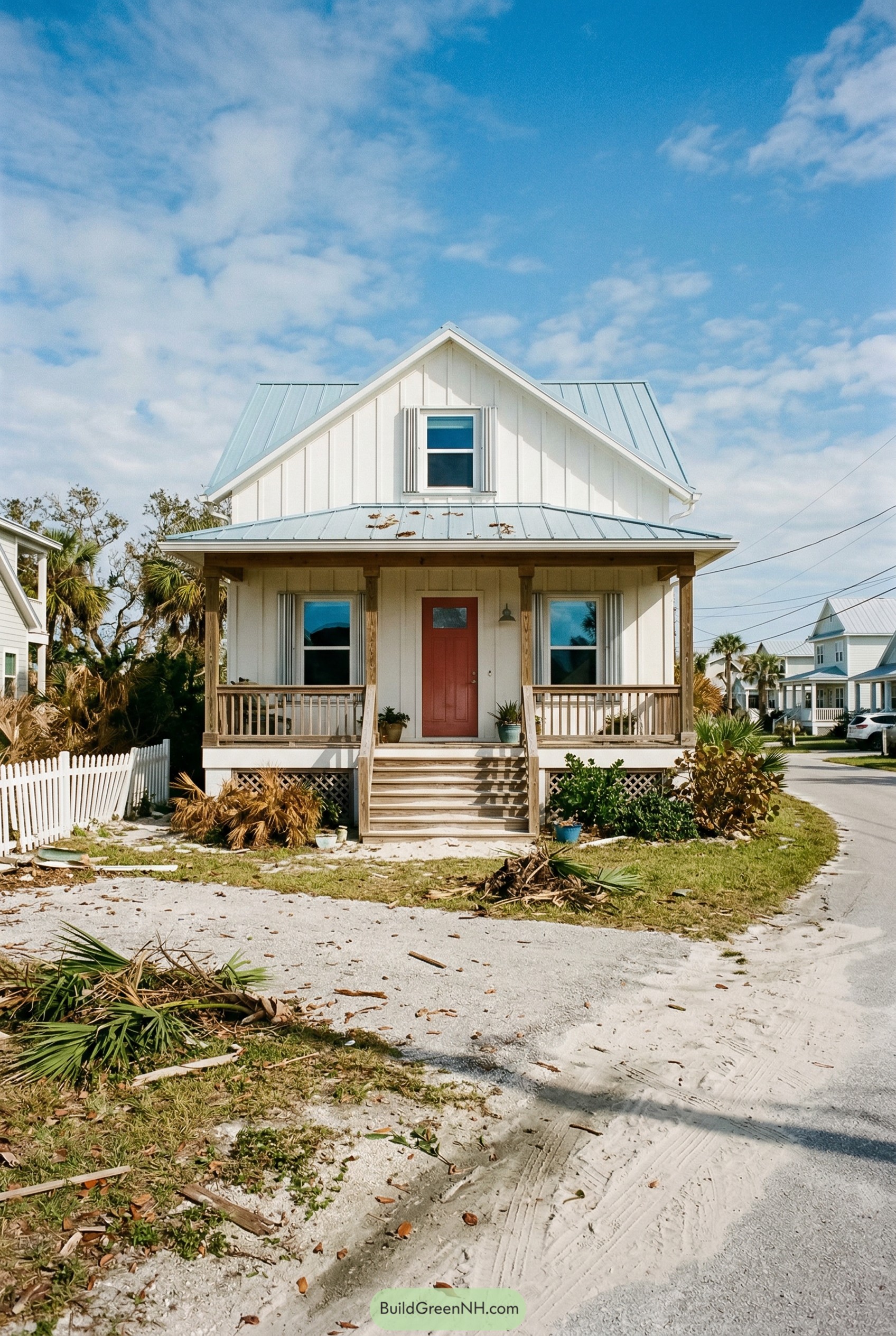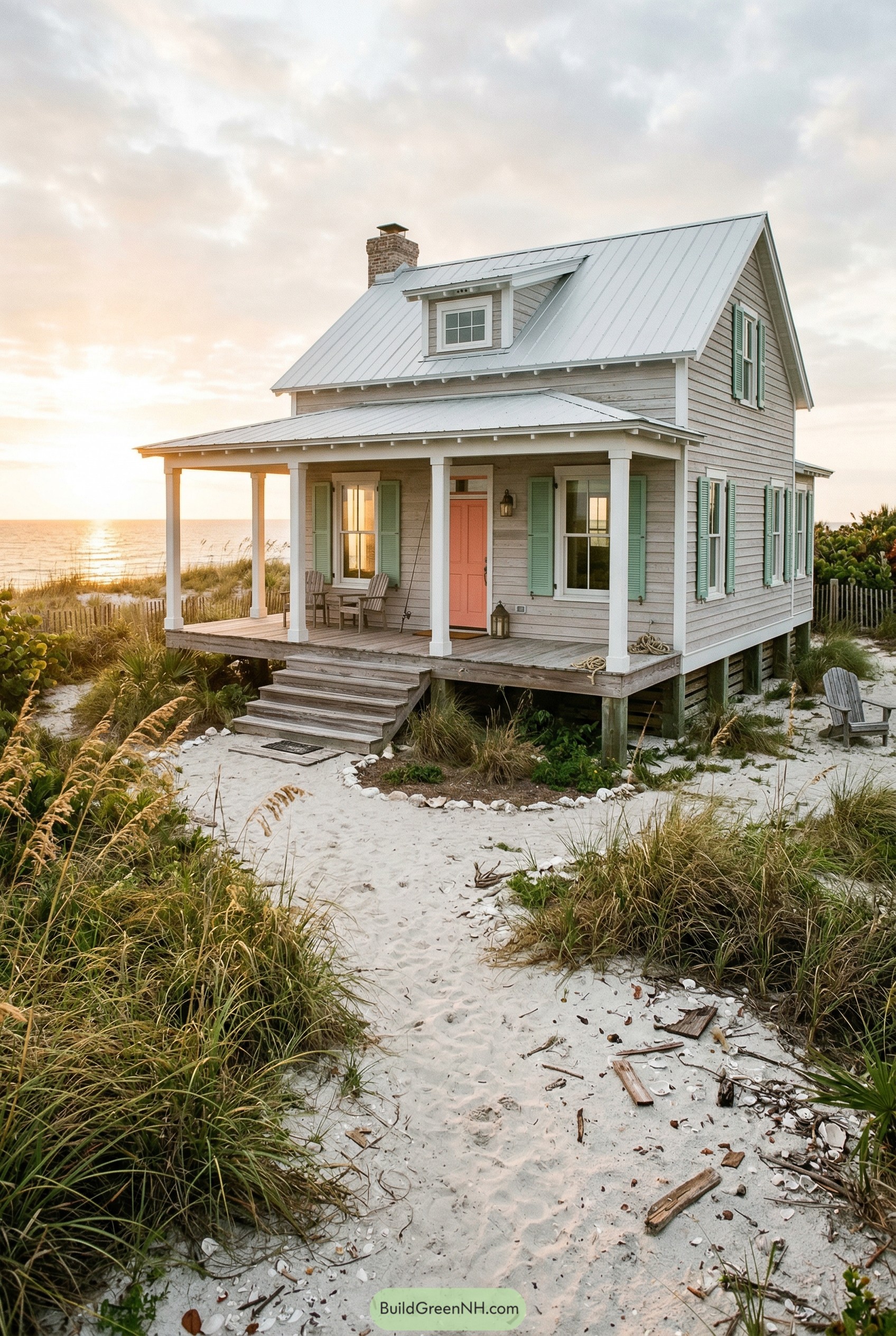 The metal roof and deep porch make a lot of sense in sticky coastal weather, and the raised steps help keep sand from strolling straight inside like it owns the place. Simple railings, flowering edges, and a glass paneled wood door make the whole design feel tucked away and welcoming.