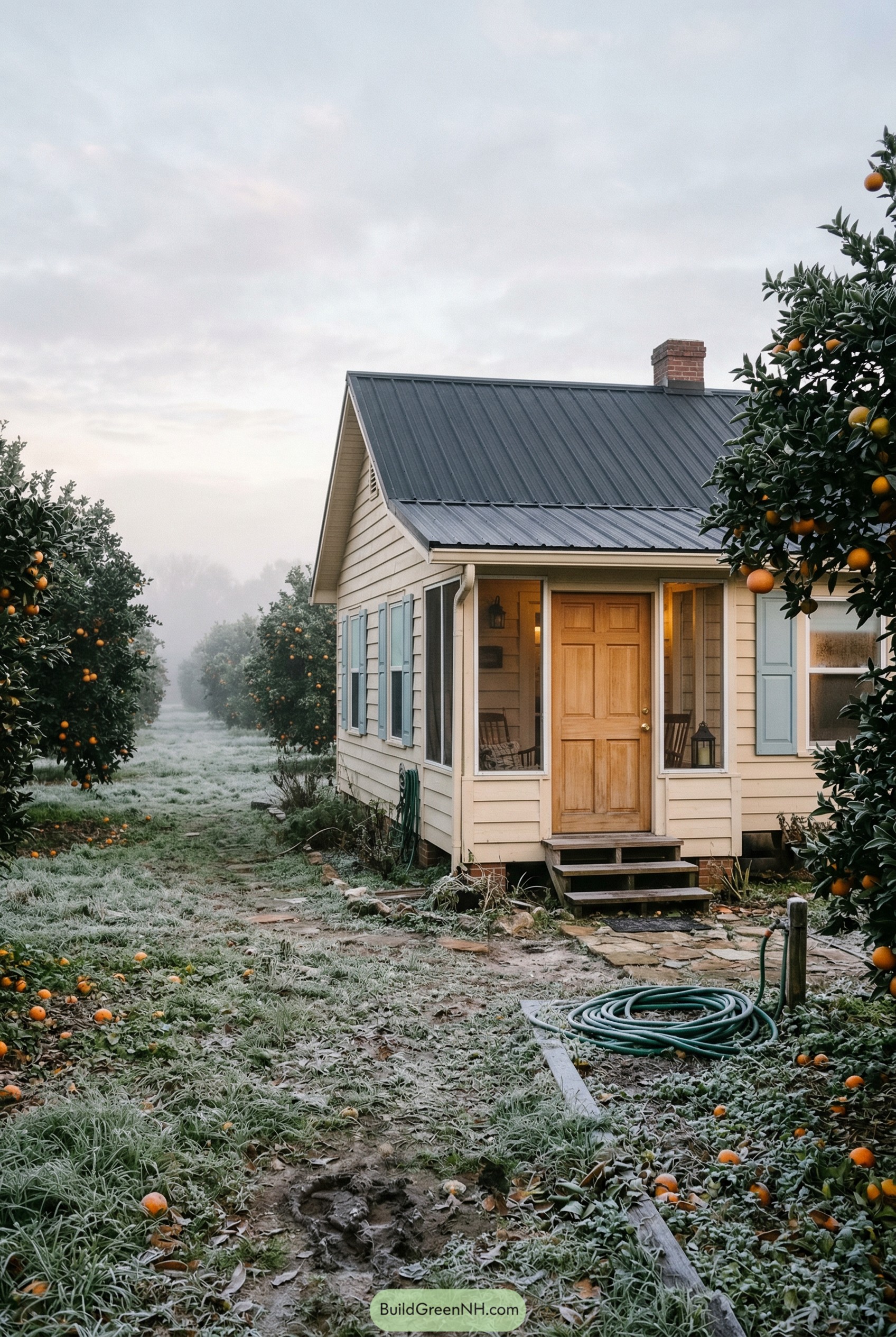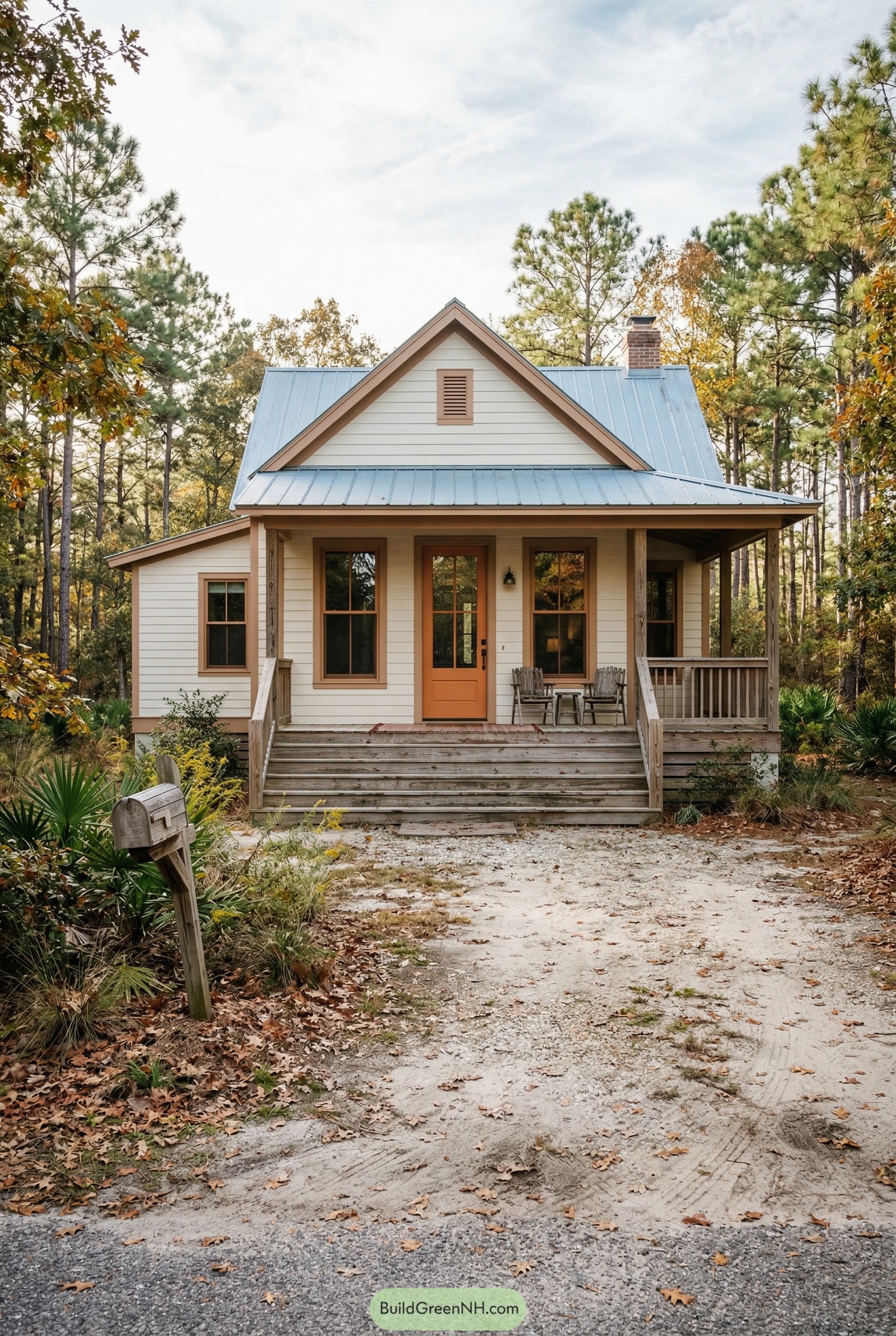 This little cottage borrows from old citrus farm dwellings, with its straightforward gable roof, pale lap siding, and a front entry that feels tucked in and protected. The dark standing seam roof gives the whole place a crisp profile, while the soft blue shutters keep it from feeling too proper, which is nice because nobody likes a cottage with a stiff collar.