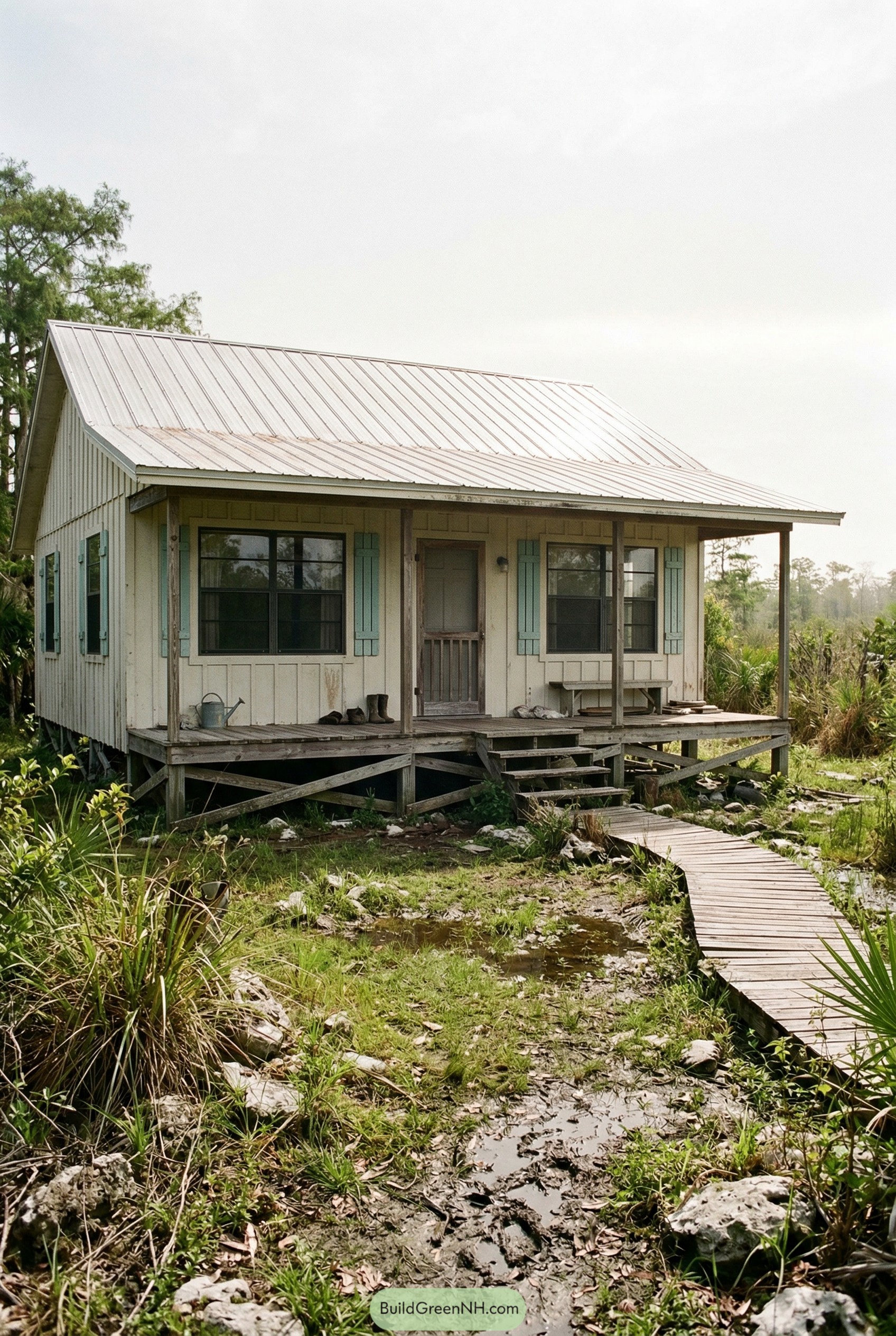 This little marsh cottage borrows from old Florida cracker houses, with a raised timber base, a broad metal gable roof, and a porch that stretches out like it knows muddy shoes are coming. The board and batten siding keeps the shape clean and calm, while the pale aqua shutters give the front just enough cheer without getting fancy about it.