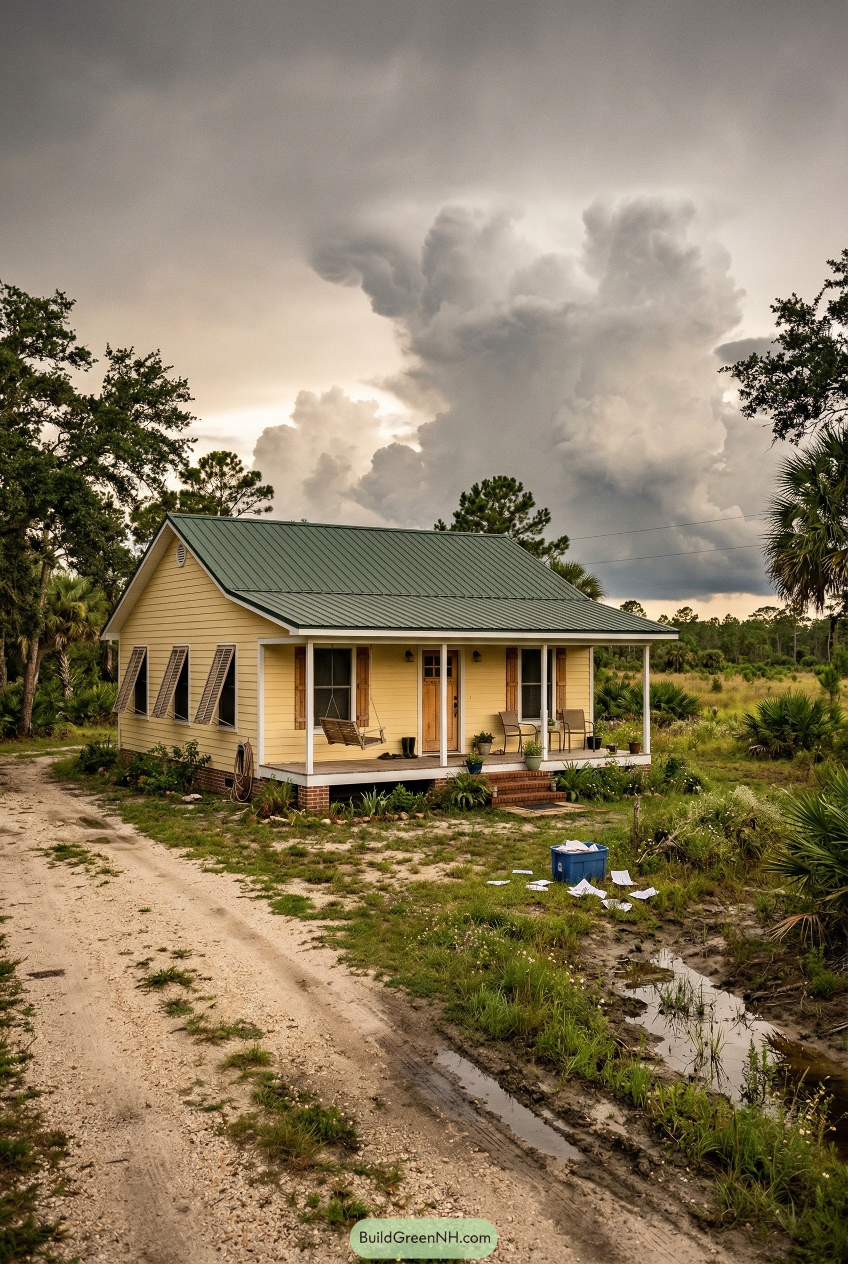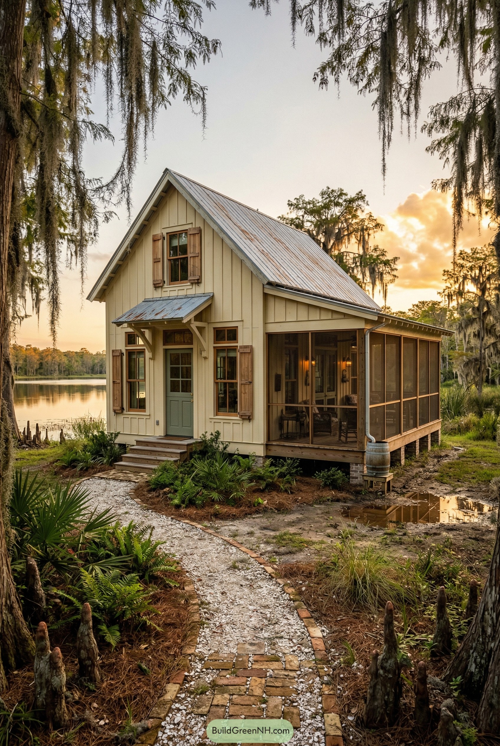 This little house leans into old Florida fish camp style with a steep metal roof, board and batten siding, and simple wood shutters that make the front feel easygoing from the first step. We took cues from cypress lake cabins and tidy barn forms, which gives it that familiar look people love without piling on a bunch of fancy stuff.