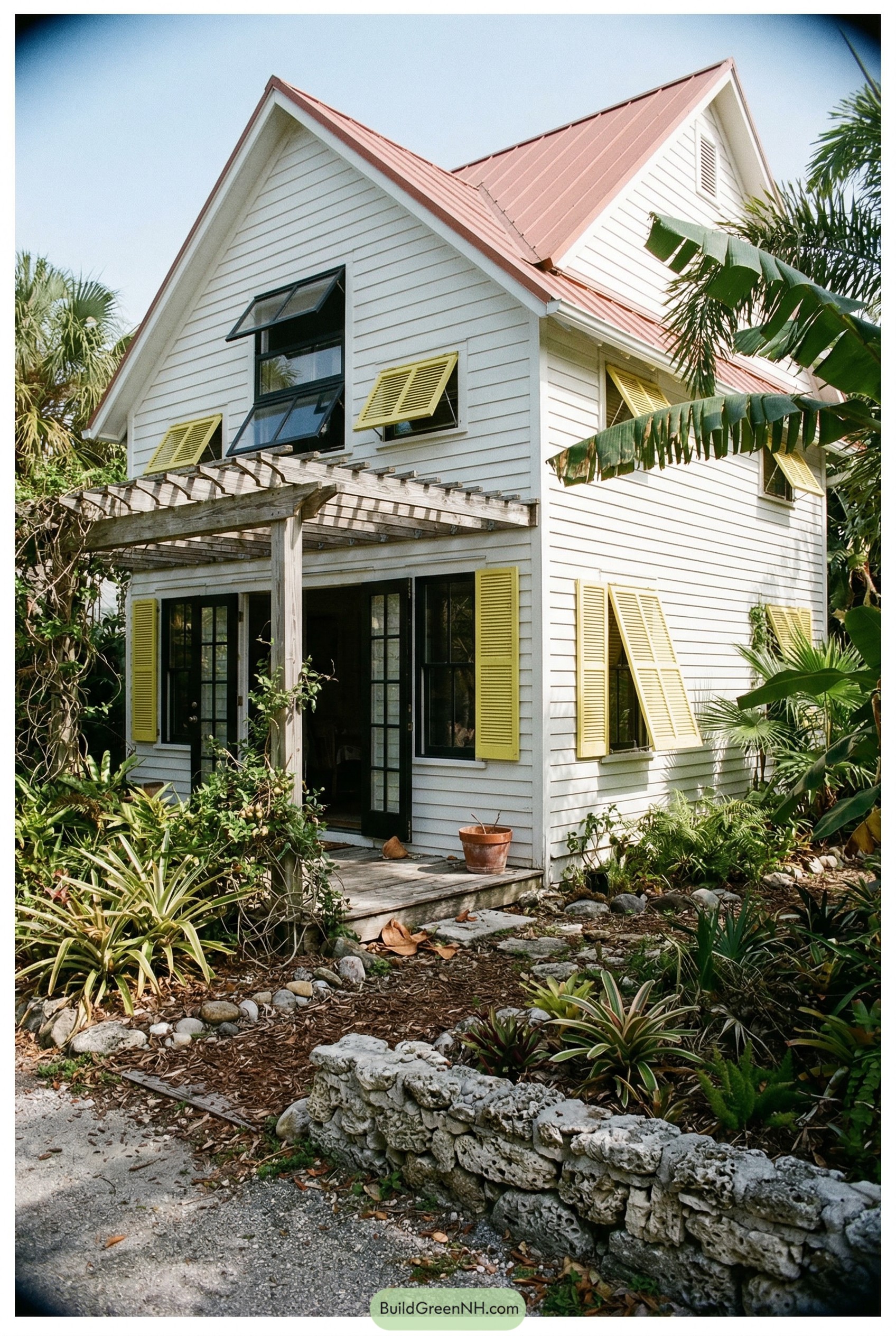 This one leans into old Florida charm with a steep coral metal roof, crisp lap siding, and punchy yellow shutters that make the whole facade feel sunny even before the weather does. We shaped it tall and narrow so it sits lightly in the garden, and those black awning windows give it a neat little wink.