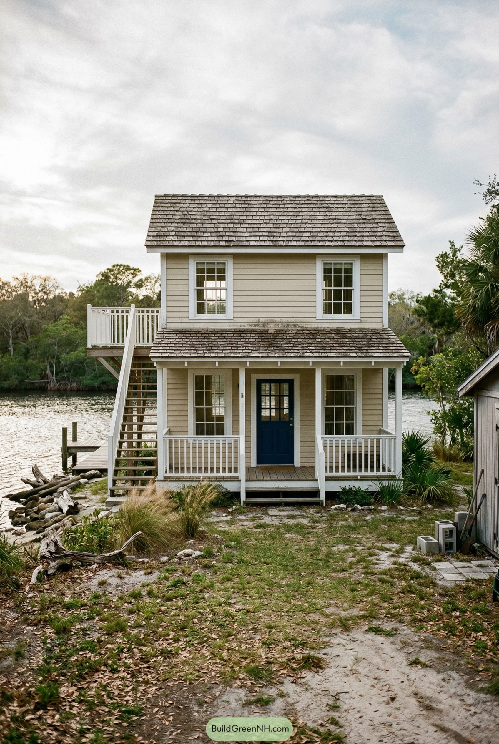 The side stair and upper deck are the clever bit, giving the house a breezy perch over the water without making the footprint any bigger. Pale lap siding, bright white trim, and that deep blue door keep the whole facade calm and coastal, with just enough personality to wink at you a little.