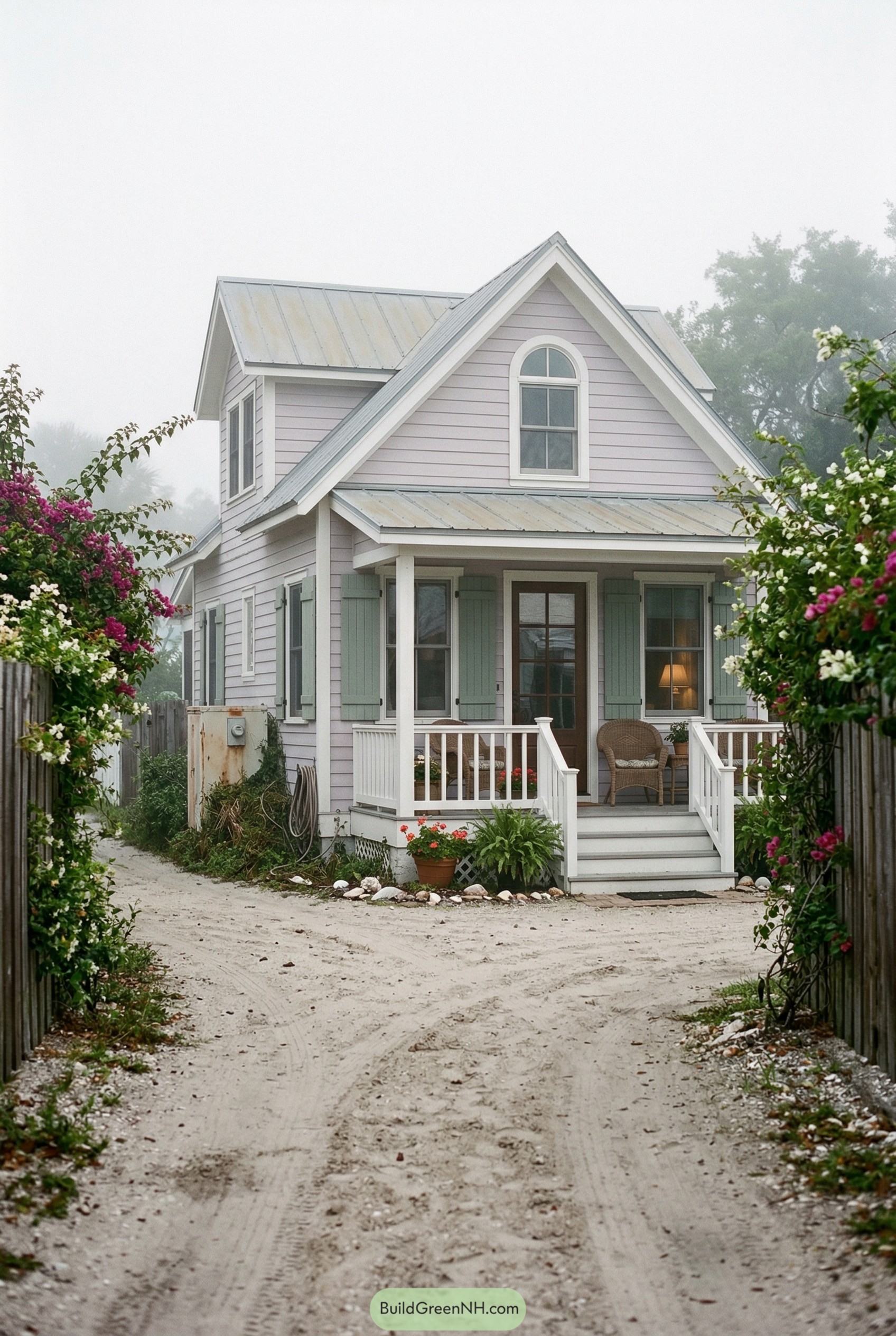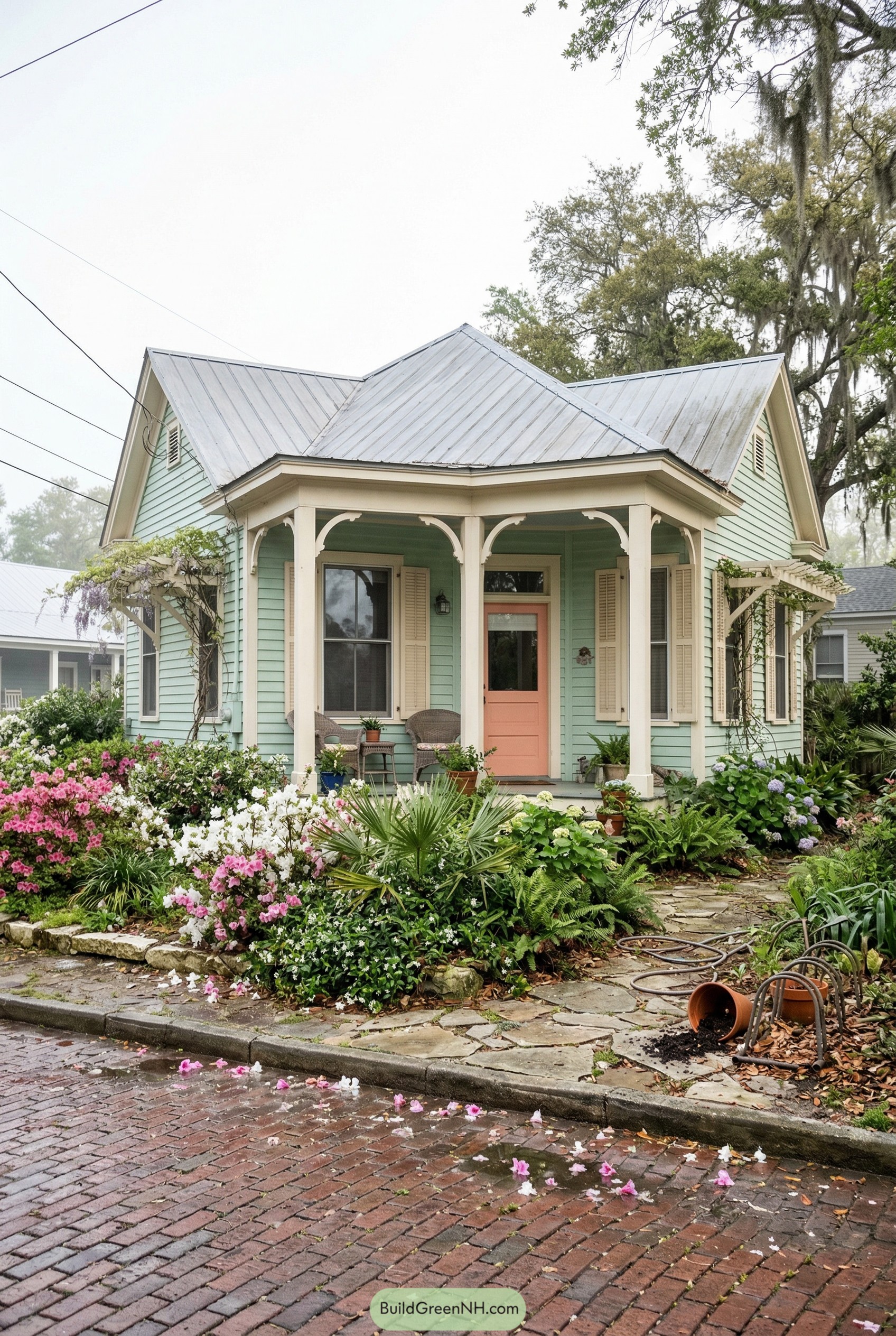 This cottage takes its cues from old Florida beach homes, with a simple gabled shape, weathered siding, and that crisp metal roof that looks ready for salty air and sudden rain. The mint shutters and coral front door keep it cheerful and a little flirty, which is nice because beach houses can get too serious for no good reason.