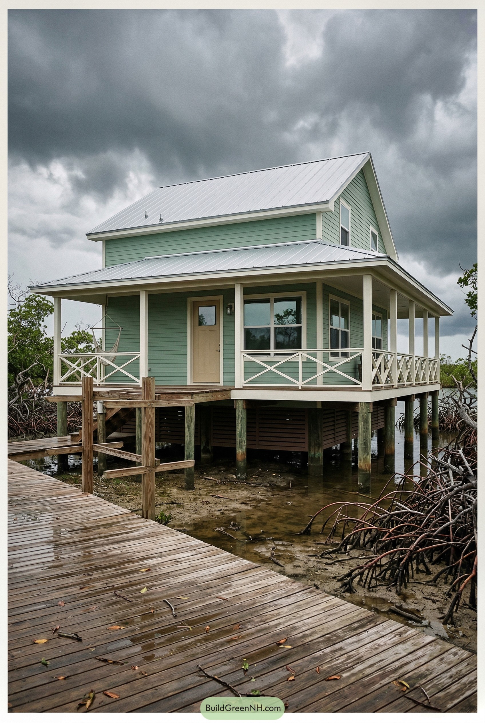 Perched on pilings above the mangroves, this little house borrows from old Florida fish camp forms but cleans them up with a crisp metal roof and soft mint siding. The tall gable keeps the silhouette simple, and that full porch makes the whole place feel ready for coffee, rain, and maybe a long afternoon that gets away from you.