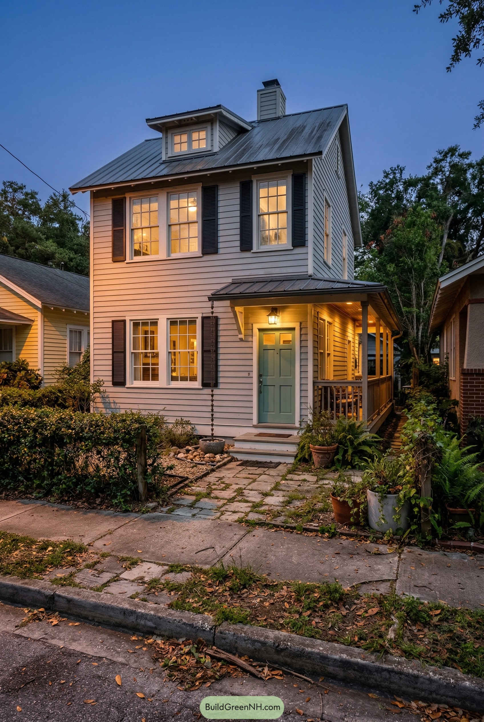 This narrow two story cottage leans into old Florida town charm with a standing seam metal roof, crisp lap siding, and a tucked side porch that makes the footprint feel a touch bigger than it is. The soft aqua front door is a cheeky little move, just enough color to say hello without turning the facade into a beach souvenir shop.