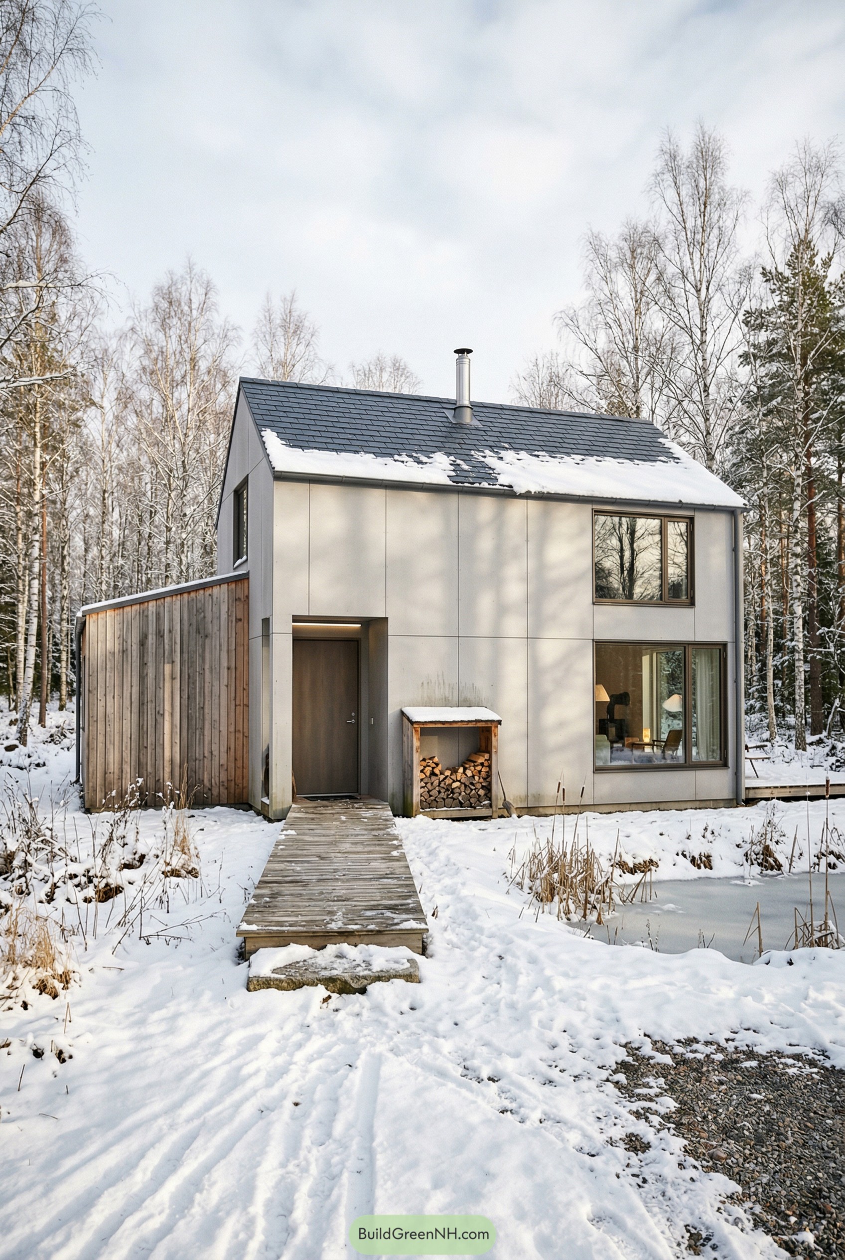 We wrapped one side in warm timber and the other in smooth panels, so it feels both familiar and a bit crisp and tailored. Big square windows frame the woods like changing artwork and the raised boardwalk entry keeps your boots out of the slush and quietly guides you straight to the front door.