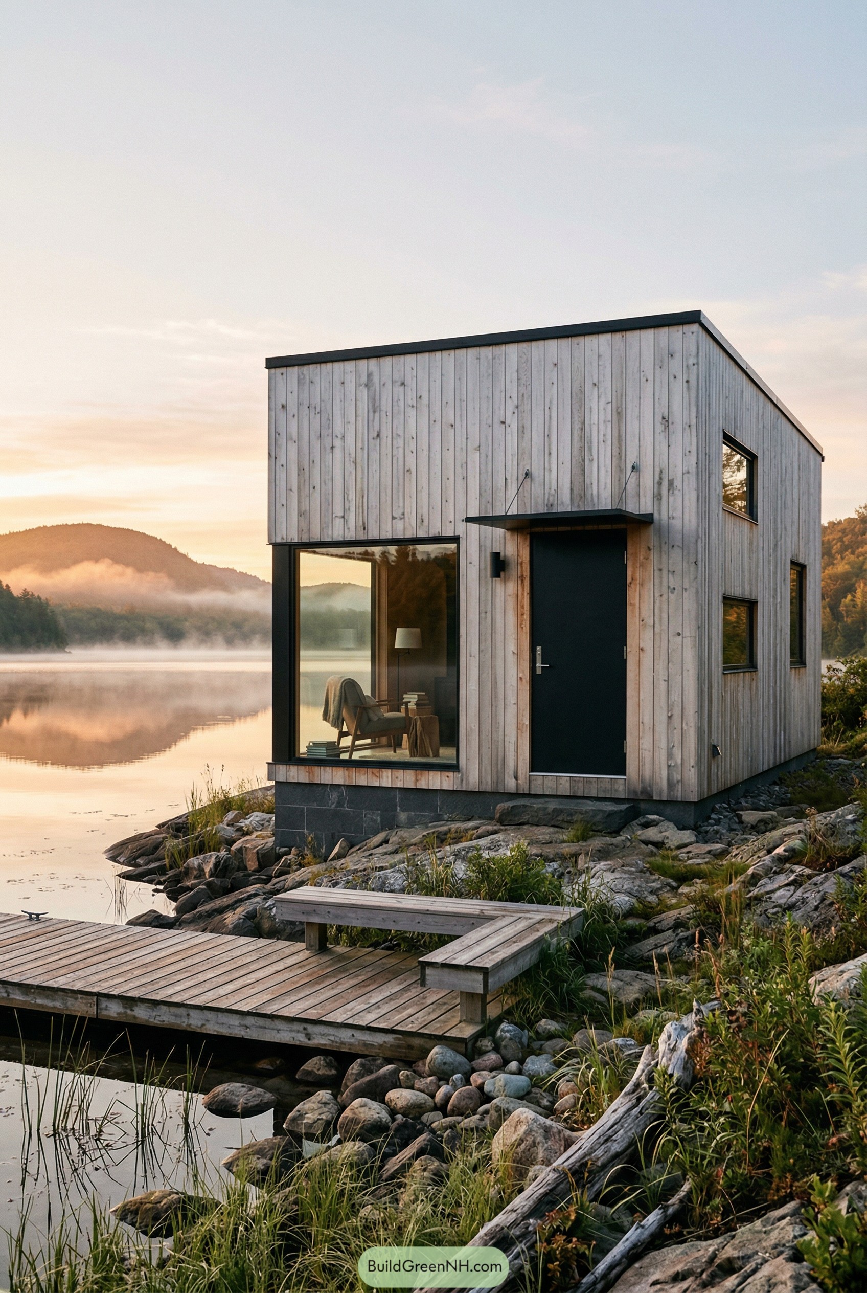 This cabin leans into a simple boxy form that feels almost like it was gently placed on the rocks by hand, not dropped in by a contractor’s truck. The vertical timber cladding is left with a soft weathered tone, so it quietly blends with driftwood, stone and that glassy water right at its feet.