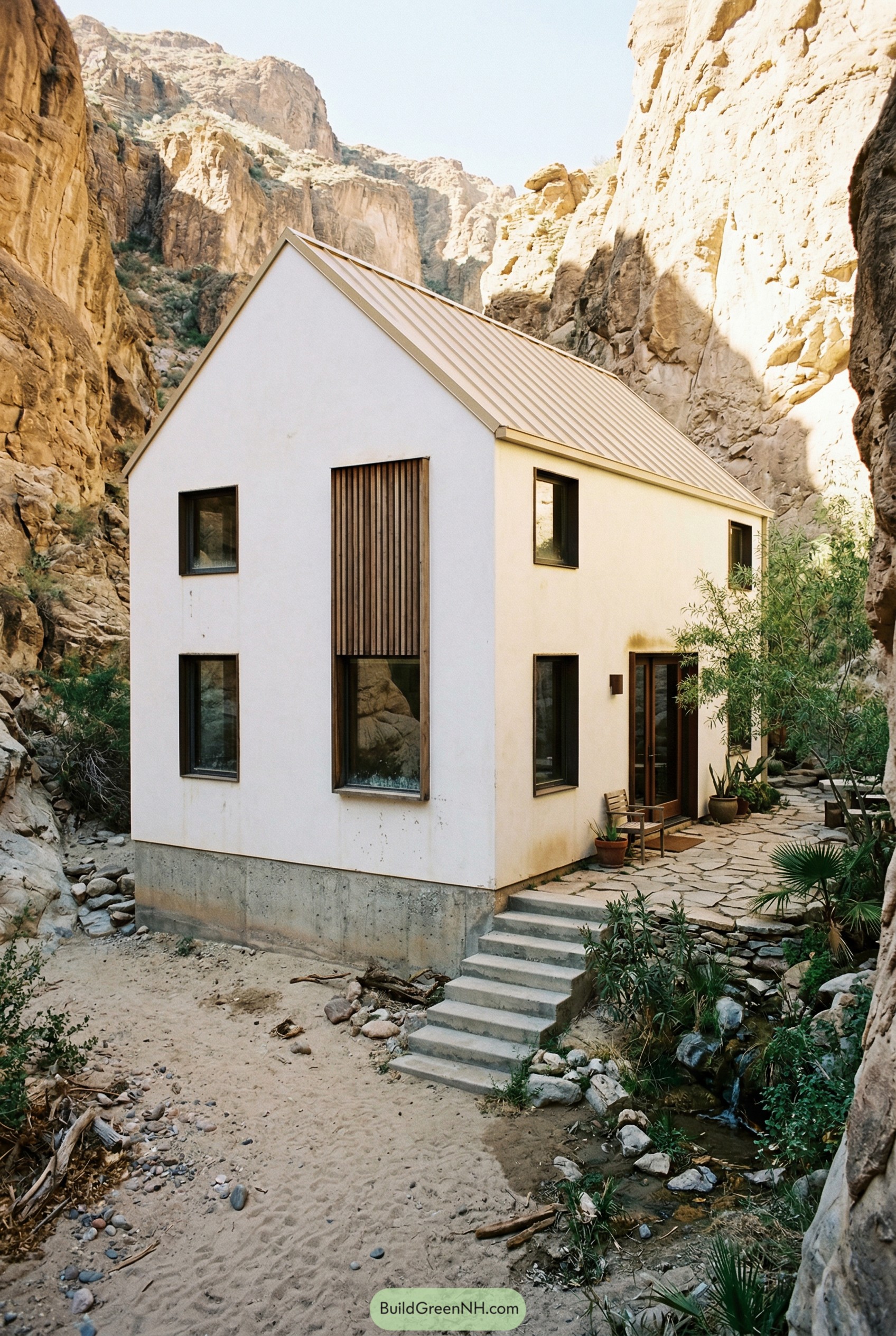 This little canyon dwelling borrows its simple silhouette from classic farmhouses, then strips everything back so the clean white walls feel calm against the rugged cliffs. The tall, narrow windows and timber screen pull in views of rock and sky while keeping the facade neat and almost a bit shy.