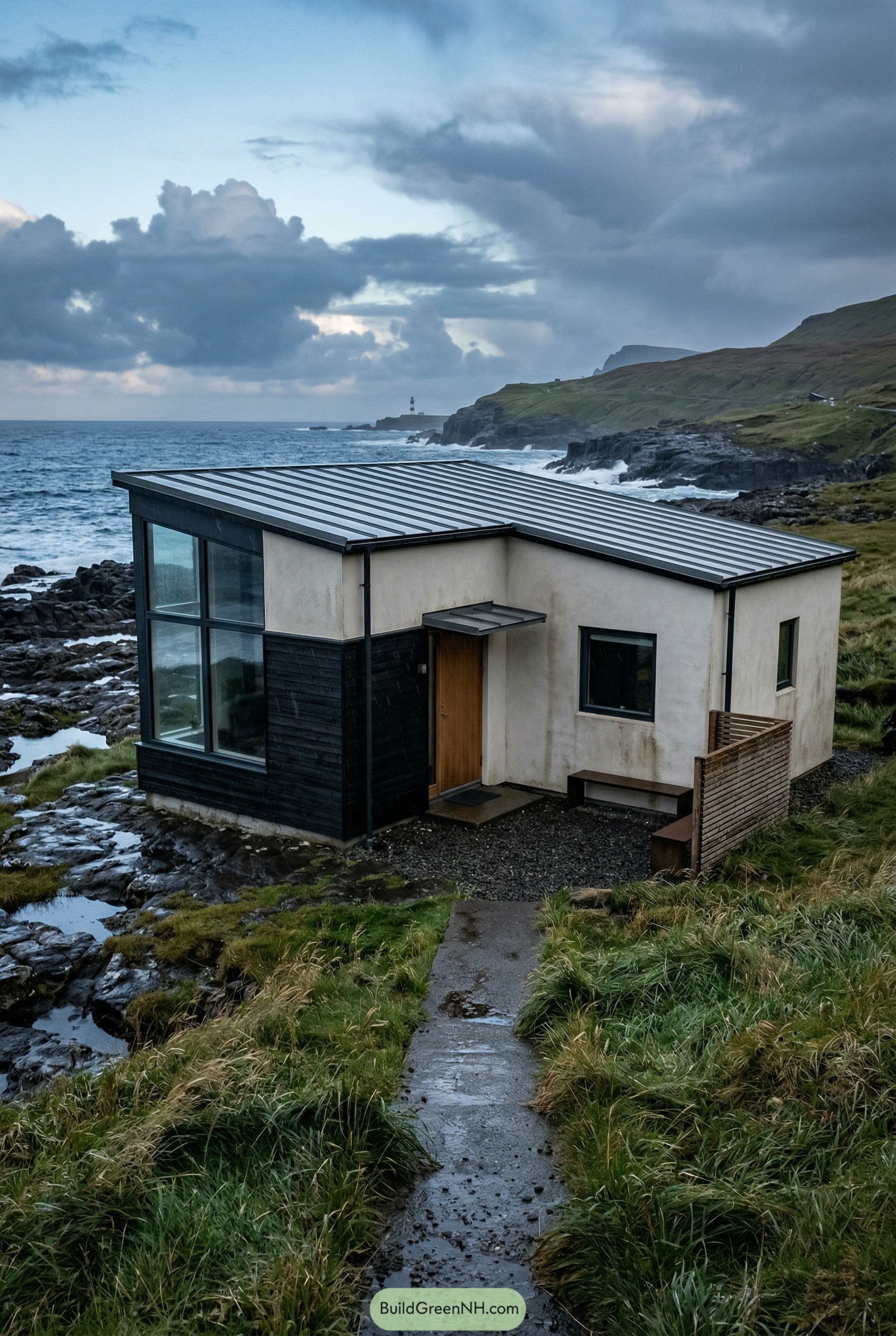 We paired light plaster walls with dark timber cladding to echo the cliffs and seaweed slick rocks nearby, giving it that “I belong here” attitude. The simple entry nook, sheltered porch, and compact bench corner make it easy to shake off rain, stash gear and then wander straight to the big window to watch the weather show.