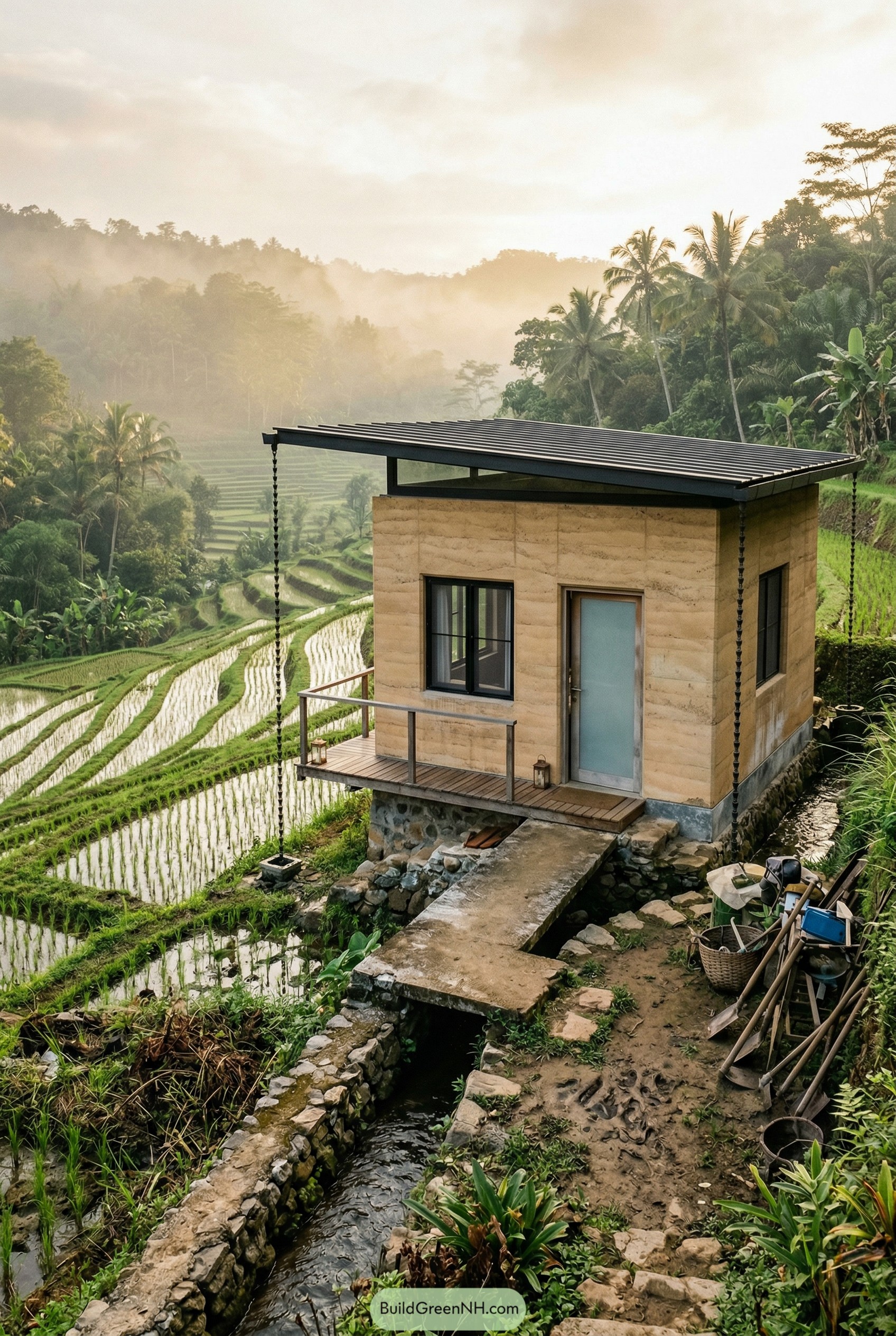 We used warm rammed earth style walls and a simple metal roof to echo traditional farm structures, just cleaned up and a bit more crisp. The long roof overhang and the chain rain diverter quietly manage the crazy tropical downpours, so the owner can enjoy the view without also owning a moat inside.