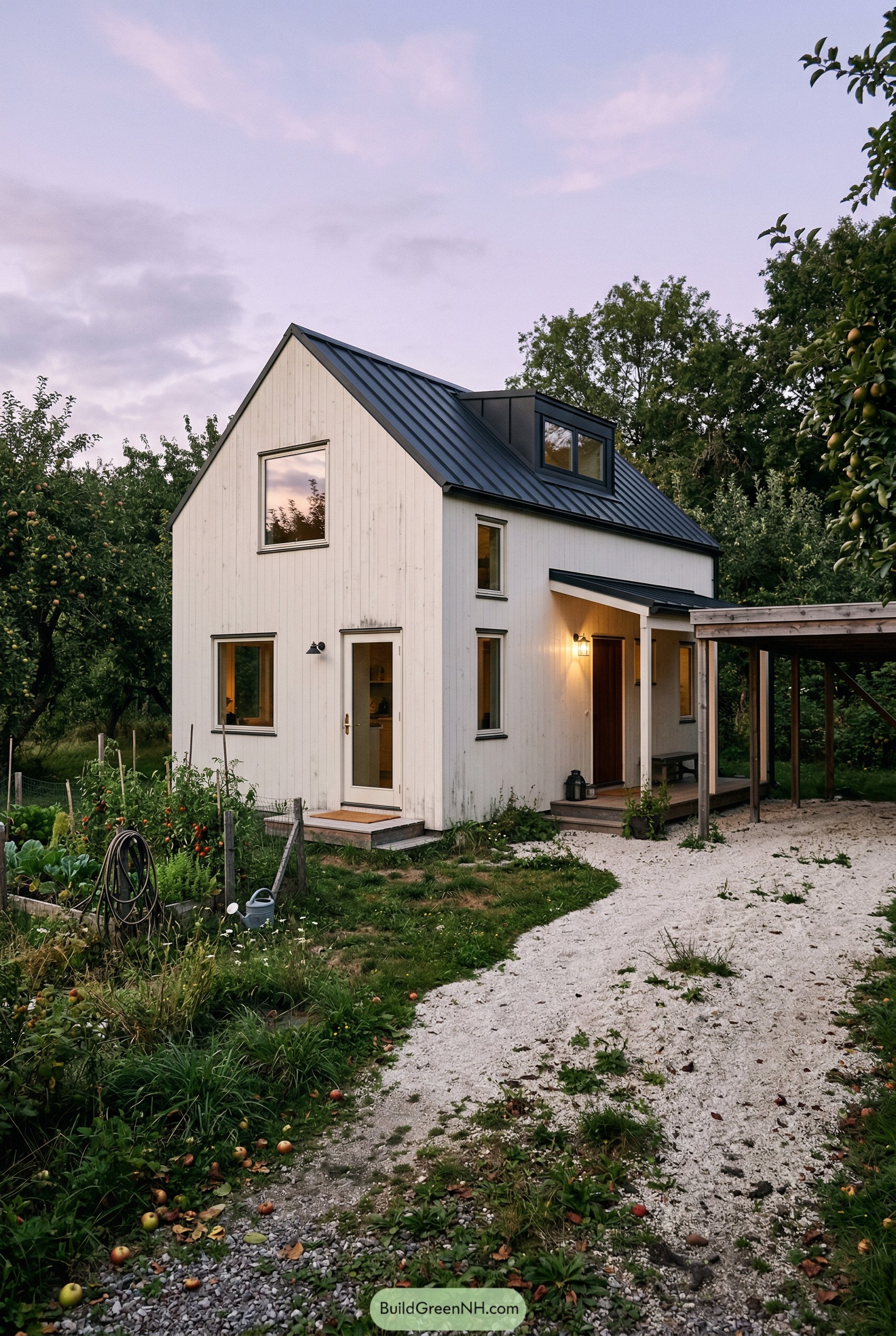 This little farmhouse cabin leans on clean lines and a tall, simple profile that tucks neatly into the orchard around it. The vertical wood cladding keeps everything calm and tidy while the dark standing seam roof pops just enough to feel a bit proud of itself.