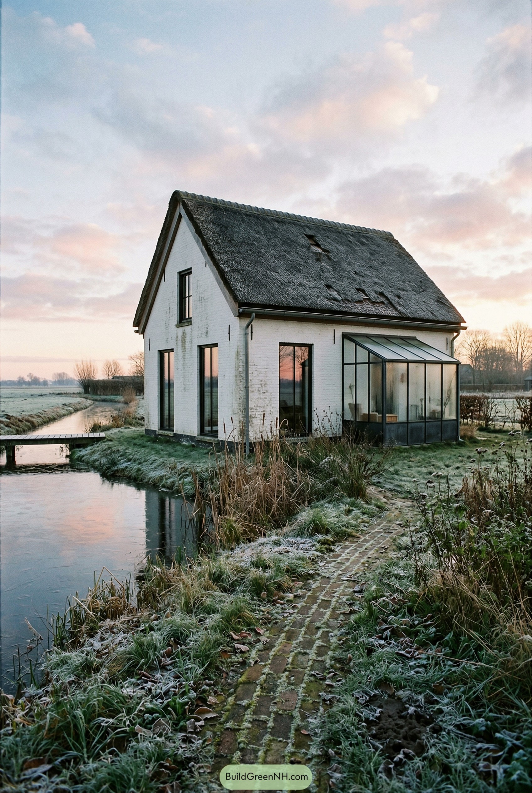 This little canalside retreat grew from our obsession with old farmhouses that secretly want to be greenhouses. The steep thatched roof keeps the profile familiar and cozy, while the crisp white brick walls give it that clean, uncluttered feel that people actually breathe better in.