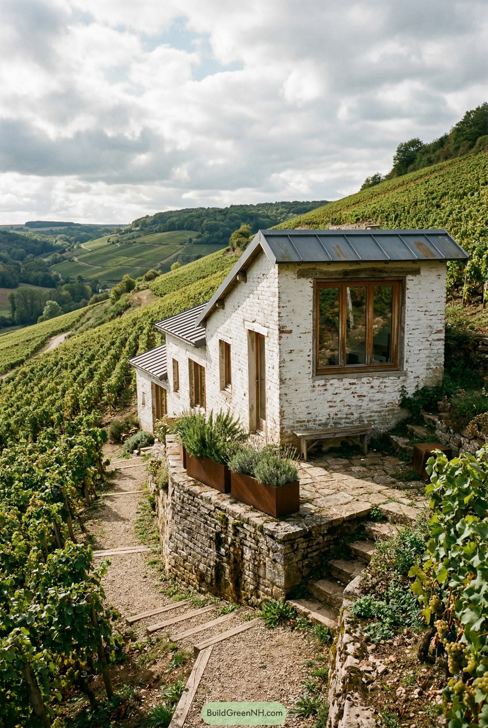This hillside retreat leans right into the vineyard, with stepped volumes that follow the slope so it feels almost grown from the terraces themselves. We shaped the narrow footprint to hug the path, which keeps the cottage compact and gives every room those big-frame views over the vines that people secretly daydream about in meetings.