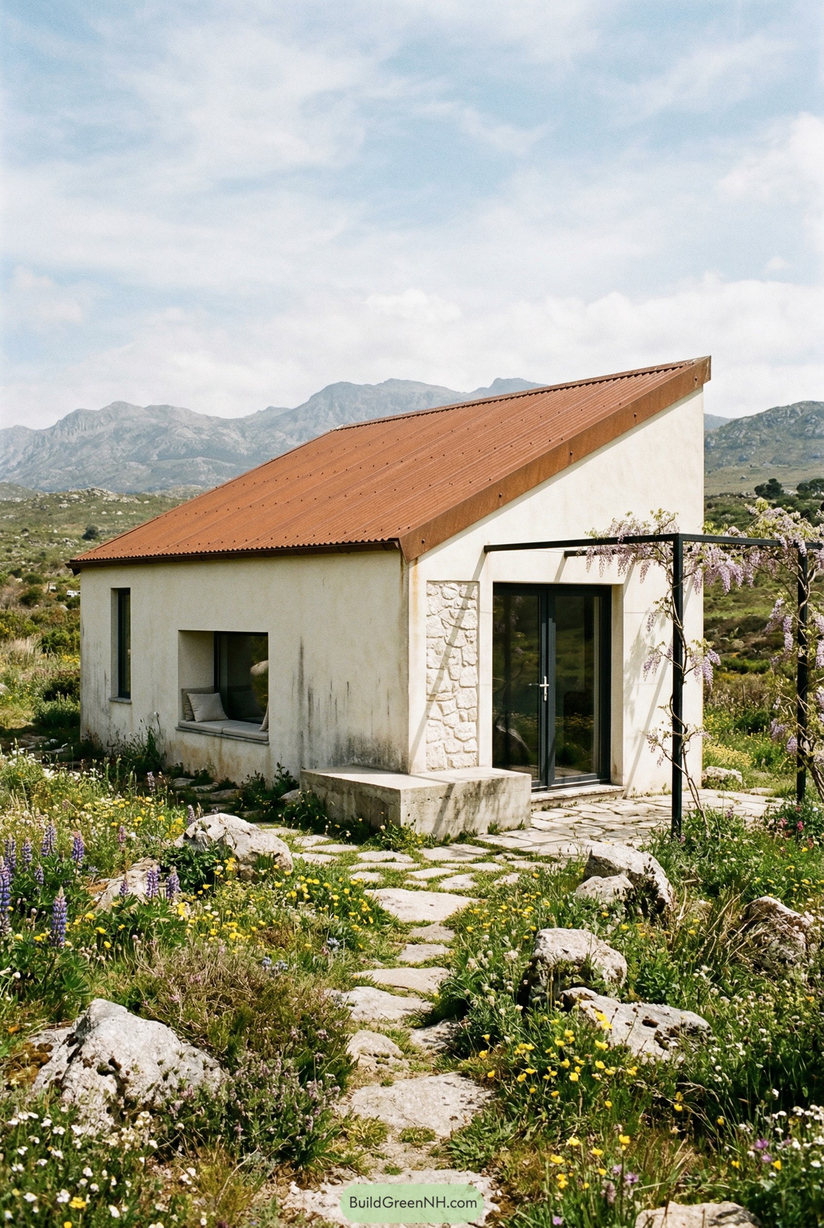 Large glass doors open straight into the view and keep the footprint compact, while the deep window seat turns that chunky side opening into the best lazy-afternoon spot. The rough stone path and low concrete bench were kept intentionally modest, because the wildflowers and distant mountains are already doing plenty of showing off.
