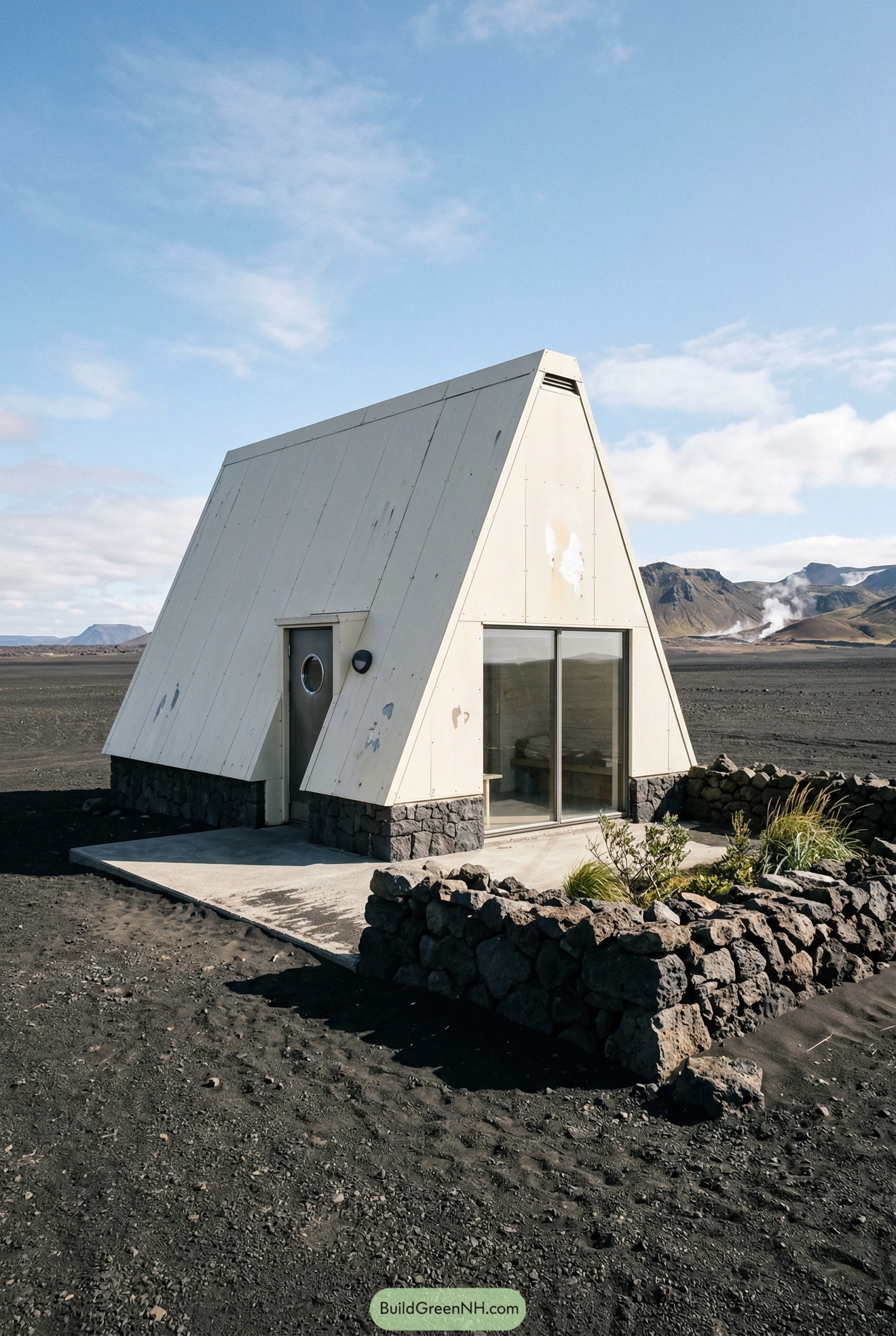 This compact A frame retreat leans into its angular shape, giving you a surprising amount of headroom inside while still feeling snug against the wide open landscape. The pale cladding plays off the dark lava rock base so the whole cabin looks like it just grew out of the ground after a very tidy eruption.