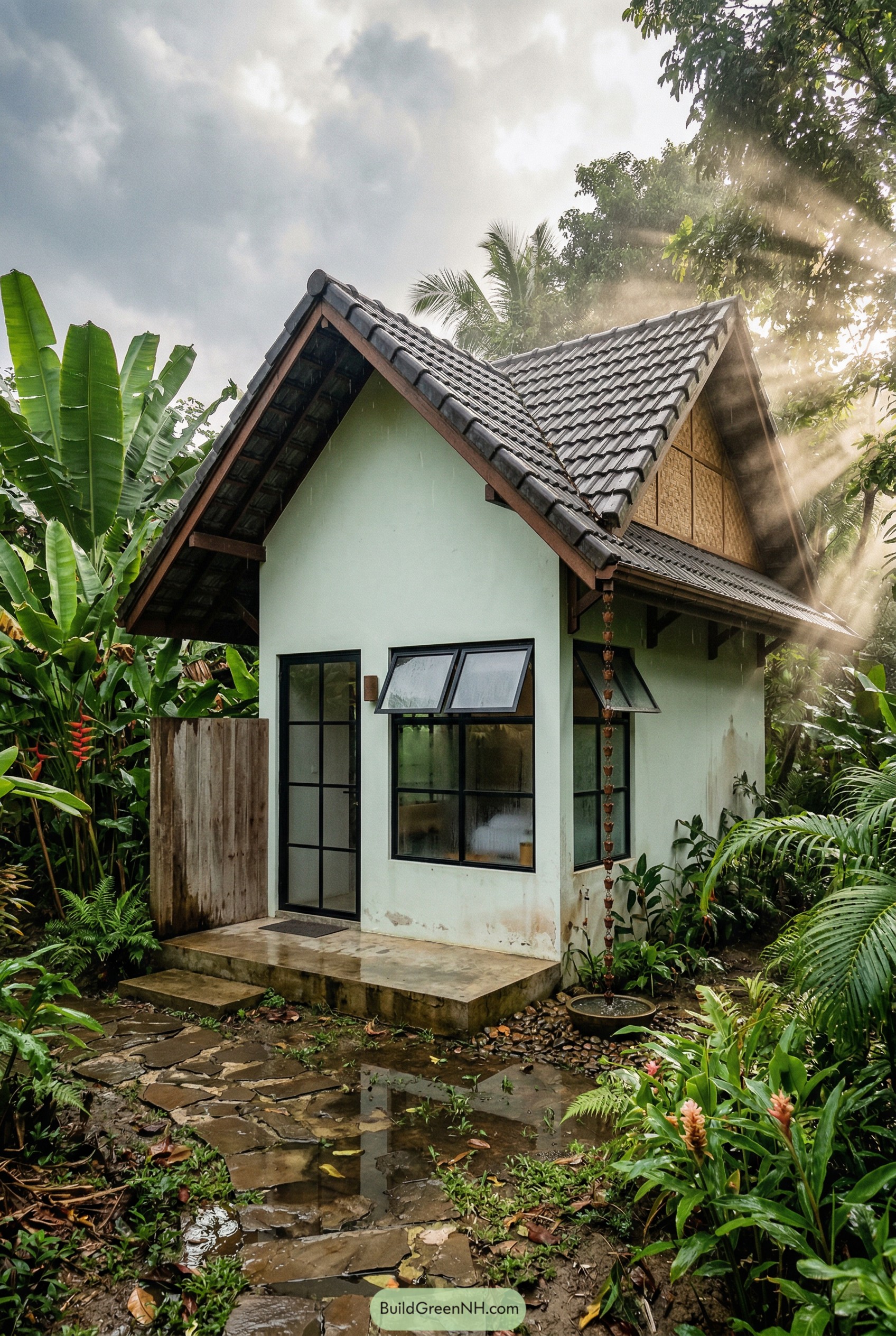 We tucked generous awning windows along the side so breezes can glide straight through and keep the interior relaxed and fresh. The rain chain at the corner turns every storm into a quiet show, guiding water into a simple bowl that keeps the garden happy and the cottage feeling a bit like it found its own tiny rainforest spa.
