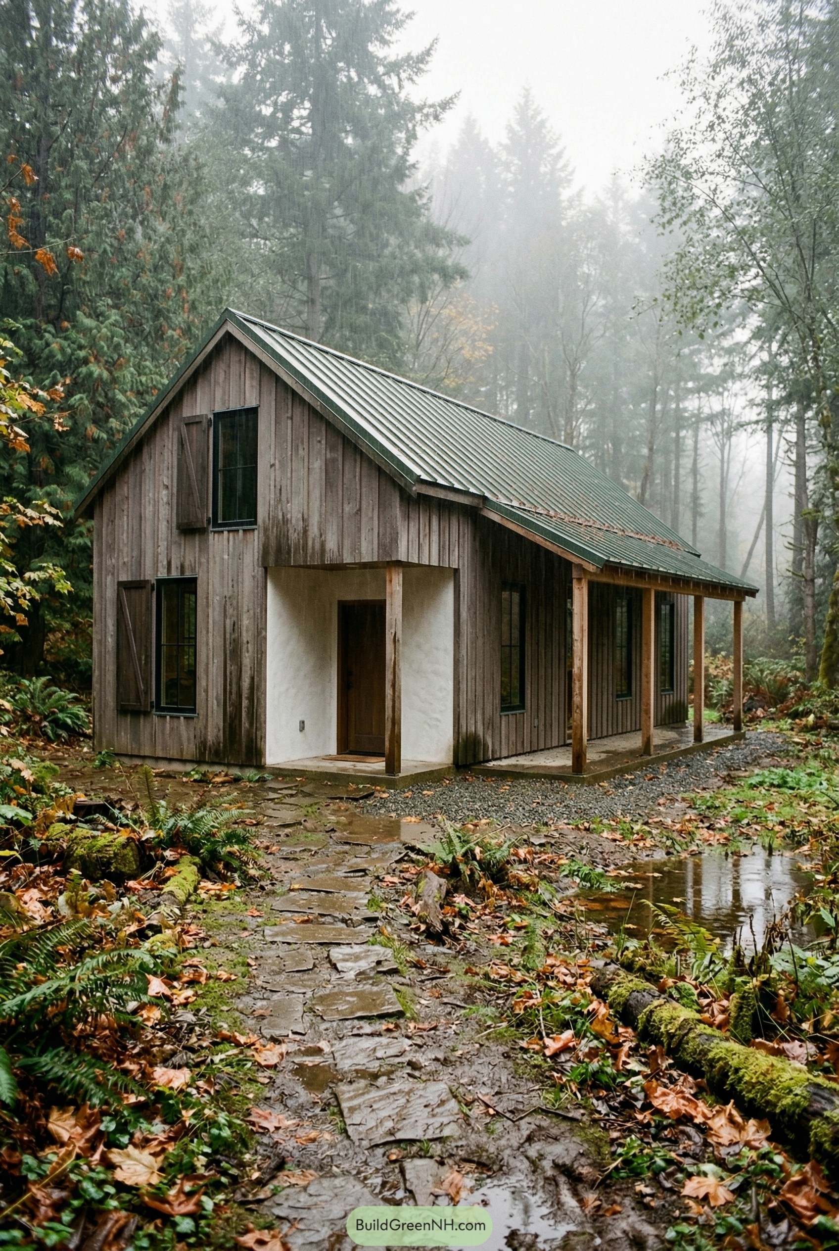 This little retreat leans into the rainy forest mood with unpainted vertical wood siding that will silver out and blend right into the trees over time. We paired it with a simple green metal roof that quietly sheds the constant drizzle and looks like it grew up from the mossy floor.