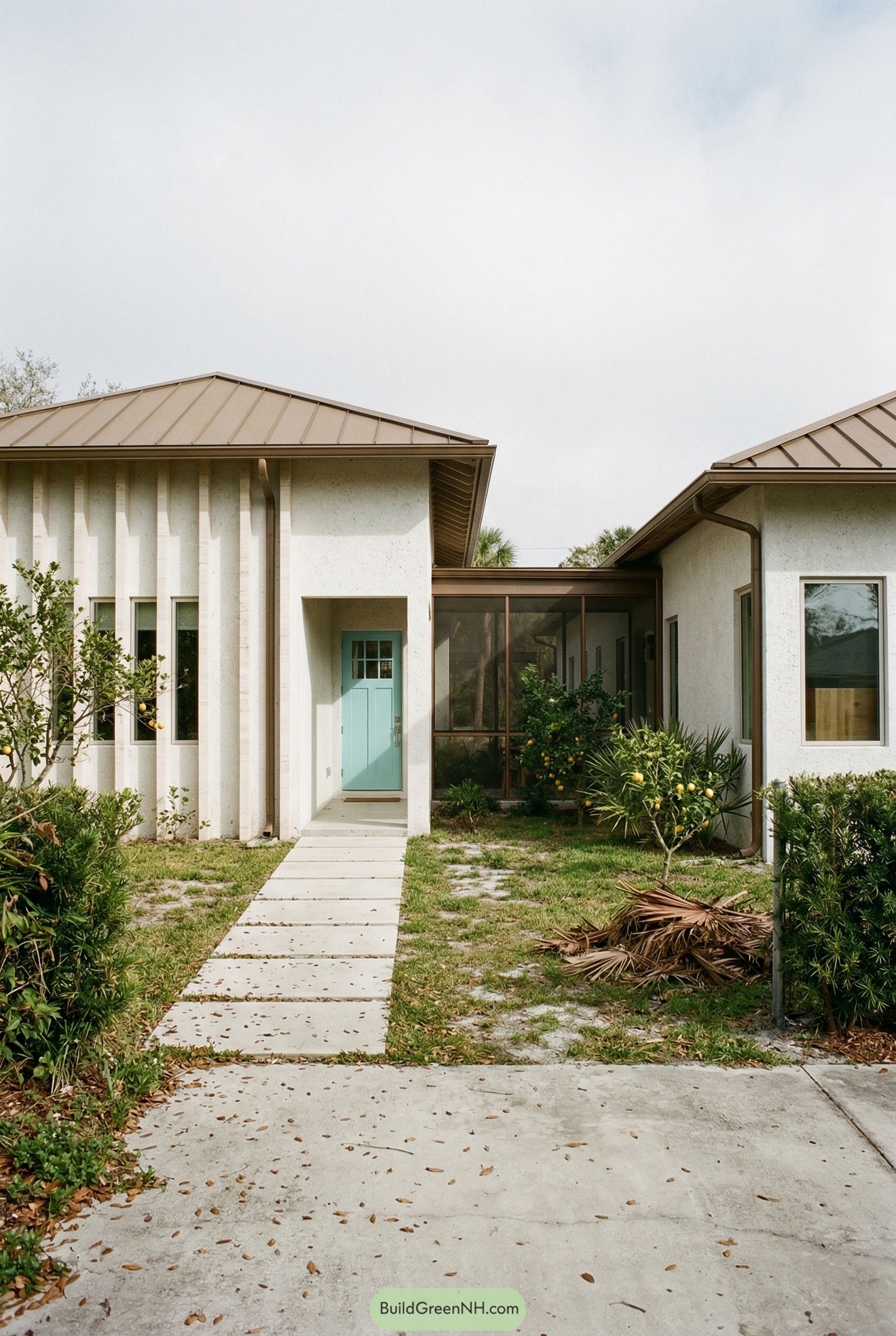 This place leans into a quiet coastal vibe with clean stucco walls, a soft sand toned metal roof, and that mint front door that pretty much waves hello from the street. Vertical fins along the left wing throw in just enough texture so the facade feels tailored instead of plain.