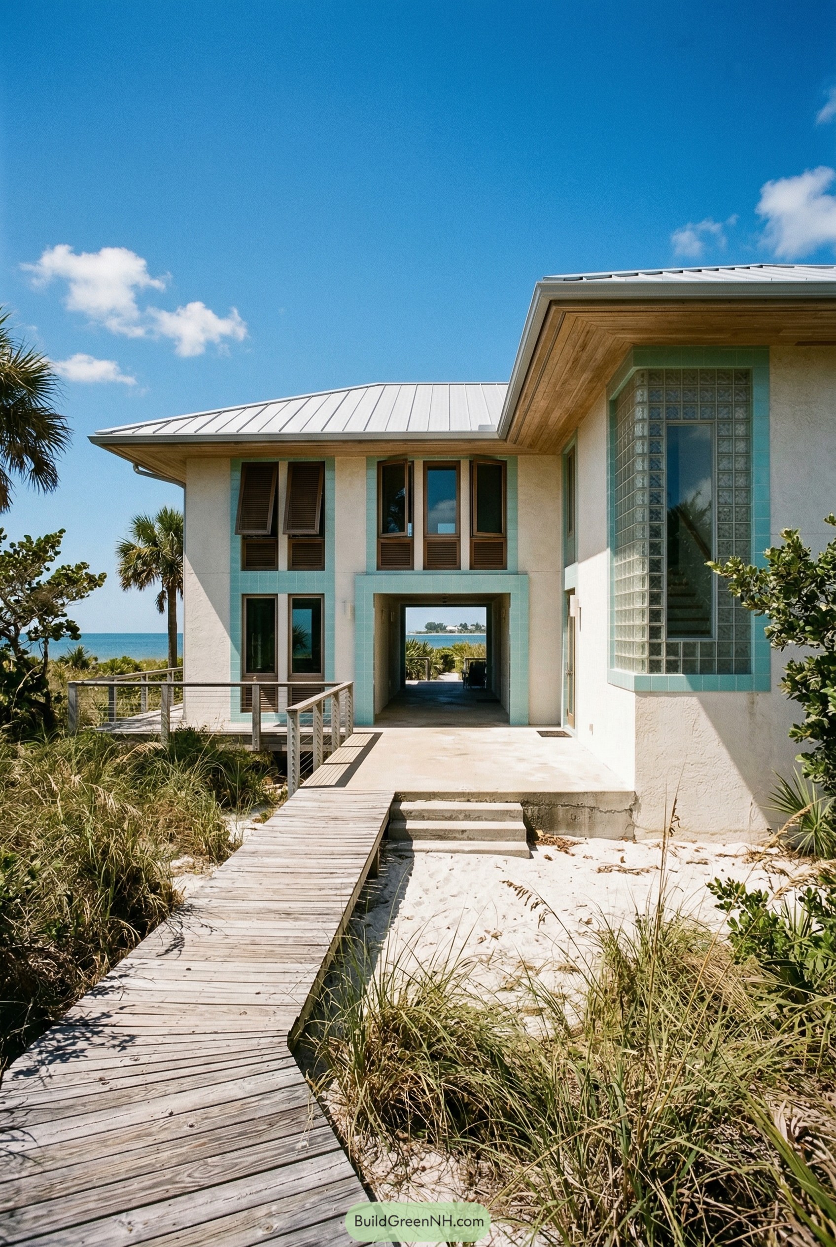 Large glass block panels wrap the stair tower and side walls, pulling in views while keeping things private enough that you can wander around in flip flops without putting on a show. The elevated walkway and open drive through breezeway are more than beachy drama, they help protect the house from shifting dunes and storms while keeping every arrival feeling like a little vacation reset.