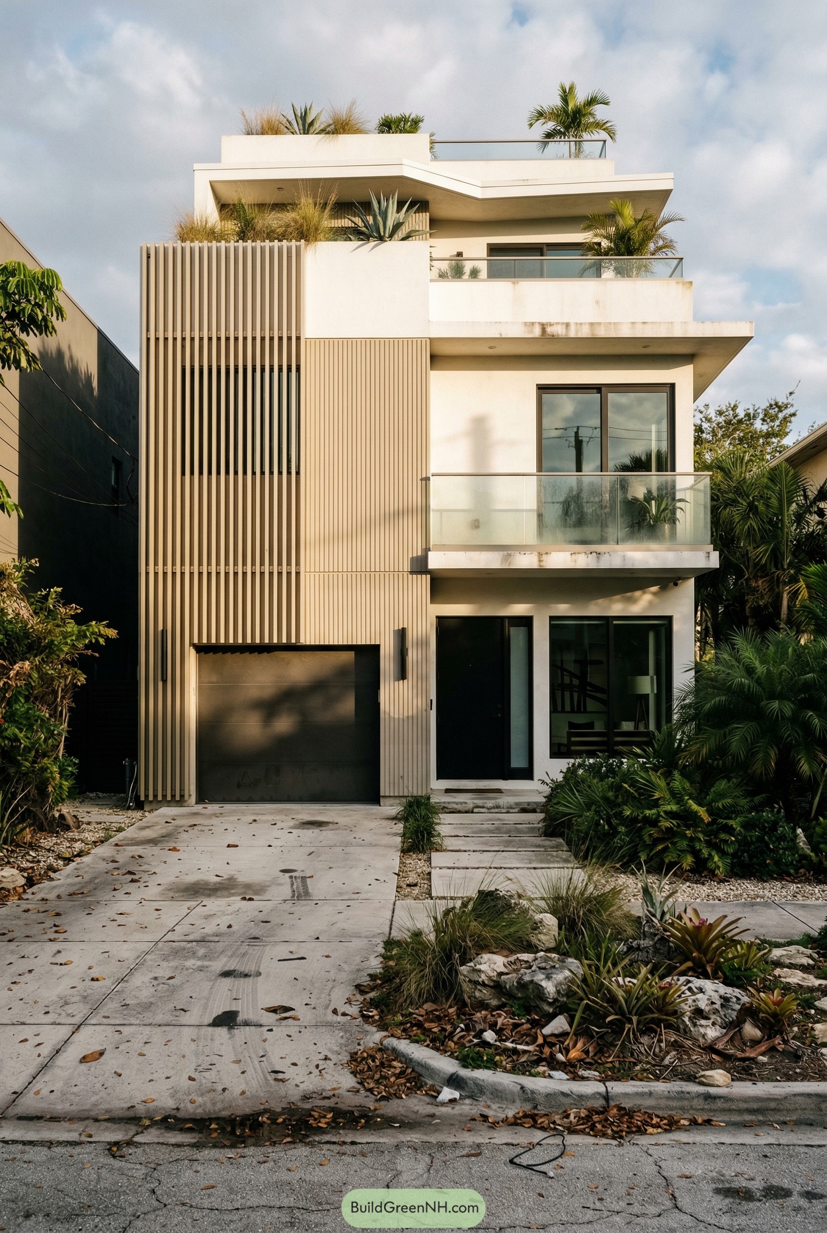 Up top, the stepped terraces and rooftop planters turn the house into a small sky garden, with palms and agaves pulling the beach vibe right onto the concrete. Glass railings keep everything feeling open and breezy, while the simple white walls and black openings make the lush front landscape really pop, like the house dressed itself in neutrals so the plants could show off.