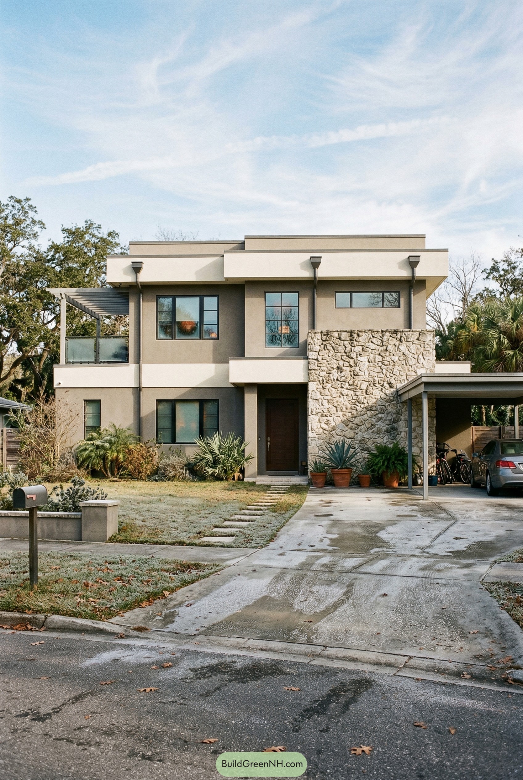 The design leans into clean lines and a calm gray palette, then wakes things up with that bold stone spine that anchors the entry. We liked the idea of a house that feels solid and coastal at the same time, so the mix of stucco, stacked stone and dark framed windows does the heavy lifting there.