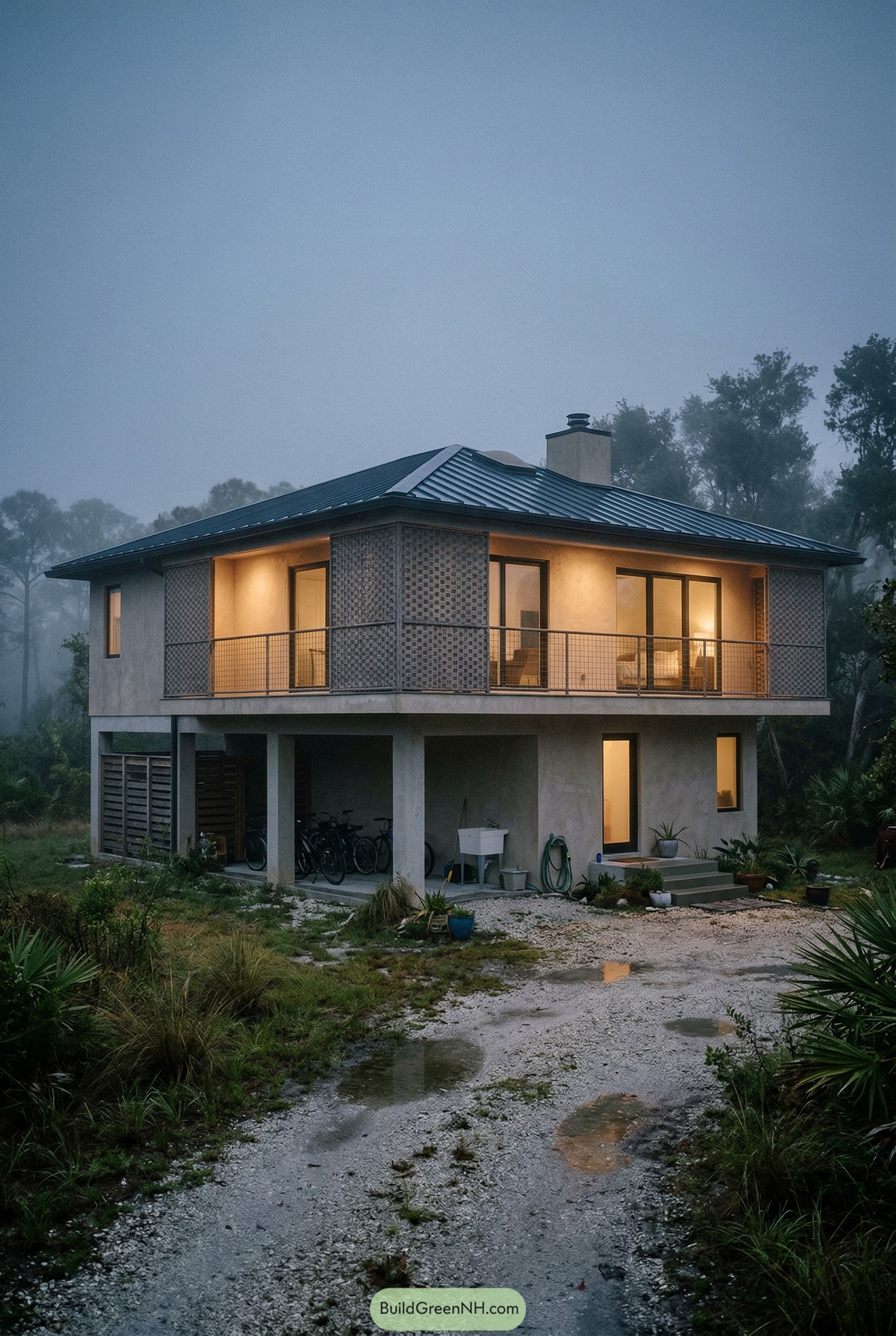 We played with a woven brick screen around the upper floor that gives privacy from the trees while still letting views filter through like a loose curtain. A low sloped metal roof caps everything in a neat, almost cabin like profile that feels relaxed and coastal, and the simple stucco and wood details keep the whole place feeling unfussy and easy to live with.