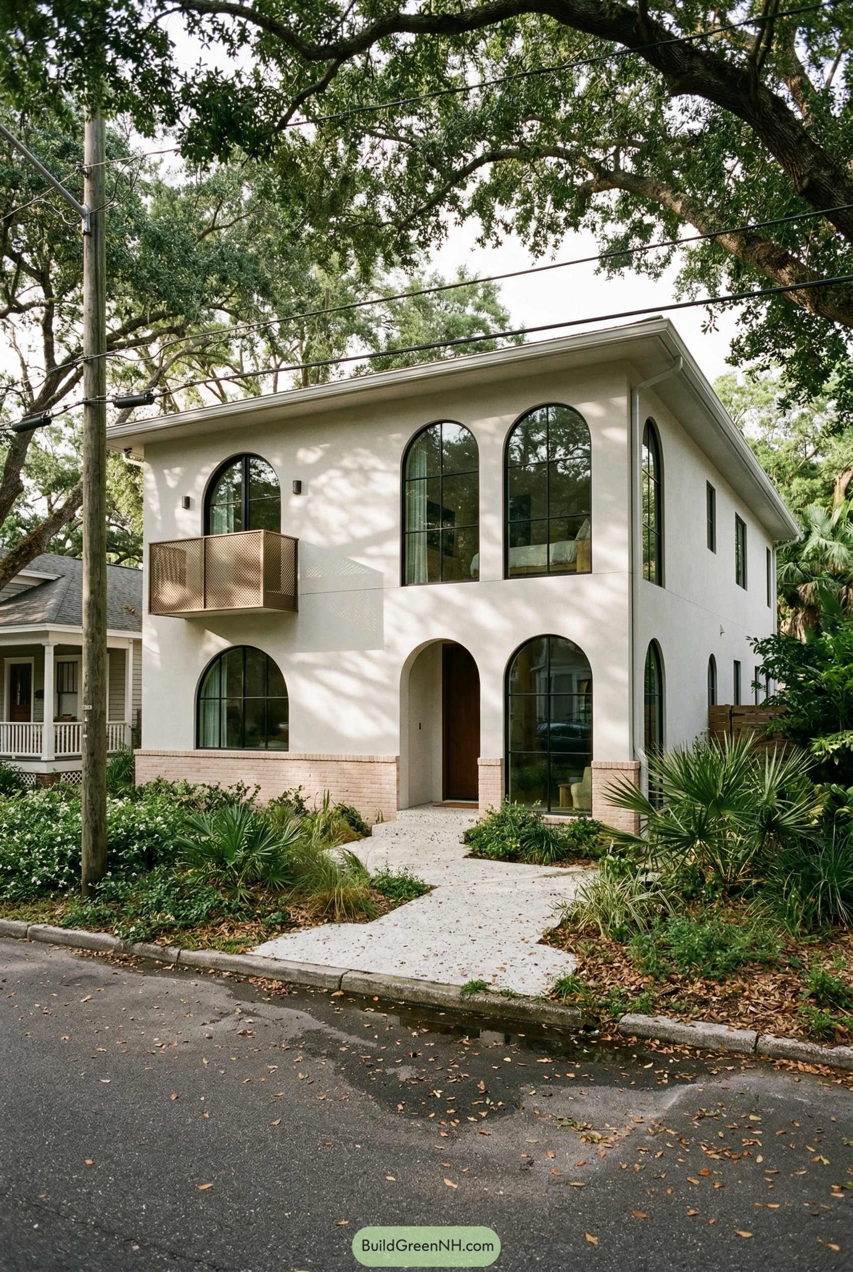 Soft stucco walls, generous arches, and that playful little balcony give this place a quiet Mediterranean attitude that just happens to live in Florida. The tall black framed windows stretch up like palms, inviting long views out to the street while still feeling nicely tucked under the tree canopy.