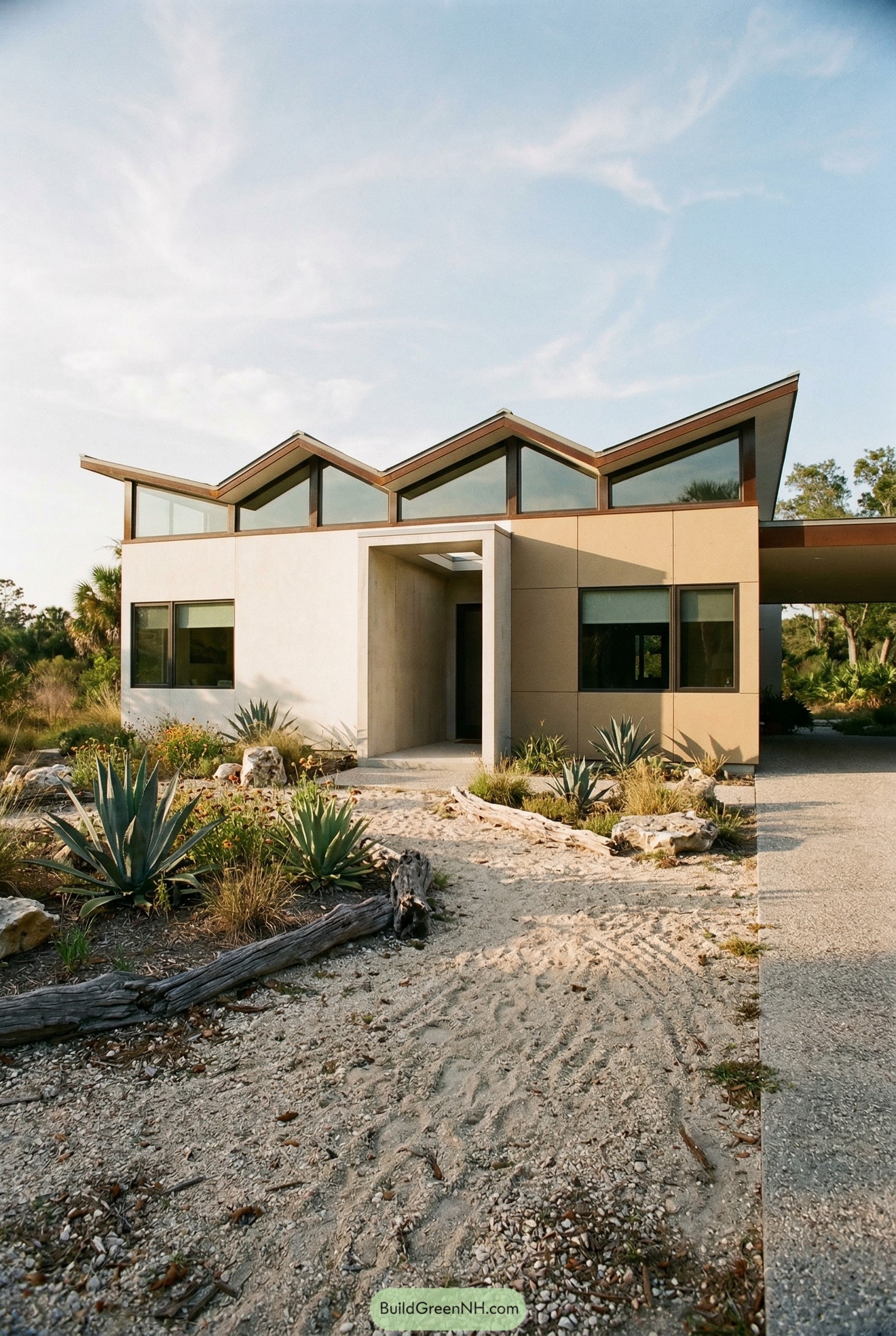 Those sharp sawtooth peaks were inspired by the steady rhythm of Gulf waves, so the roofline feels playful while still keeping everything nicely sheltered. Large clerestory windows tuck under each fold and stretch light deeper into the rooms, while the solid wall planes give the front just enough privacy so you do not feel on display.